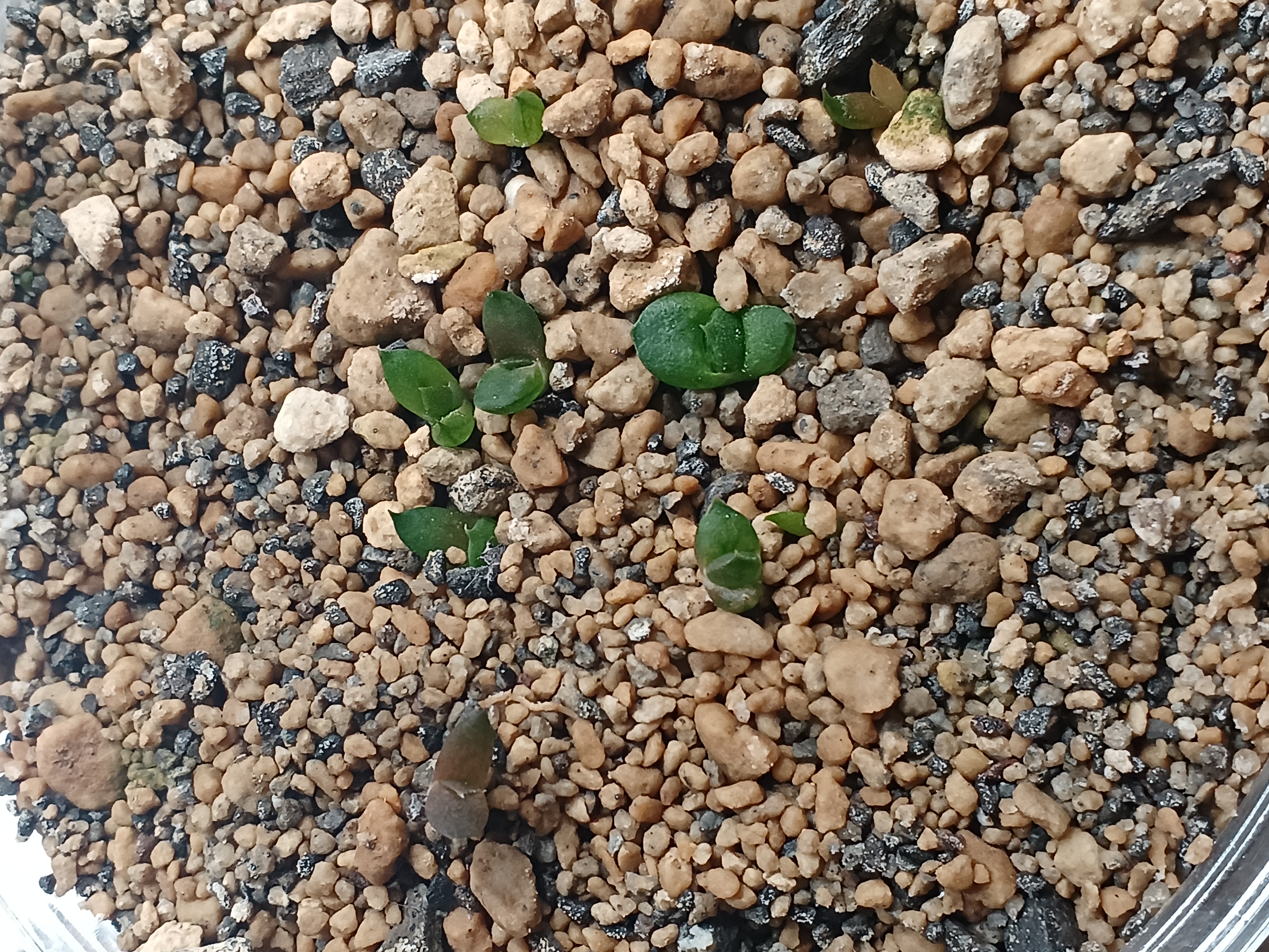 細目のボラ土に軽く埋めて播種。25度程度、LED、腰水で管理。腰水はメネデール希釈水を使用、カビ防止のため播種後に市販のスプレー薬を散布。1つ溶けて9つが成長中。