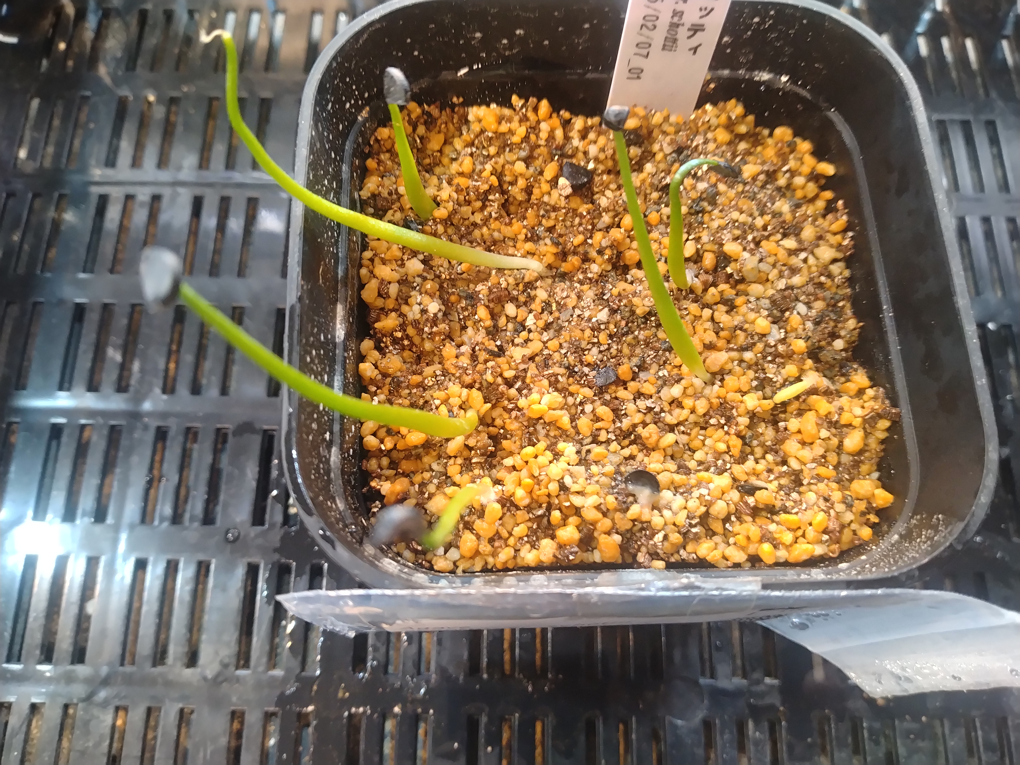 用土:下層「赤玉・鹿沼・軽石(各小粒)」上層「鹿沼細粒+バーミキュライト」に播種、