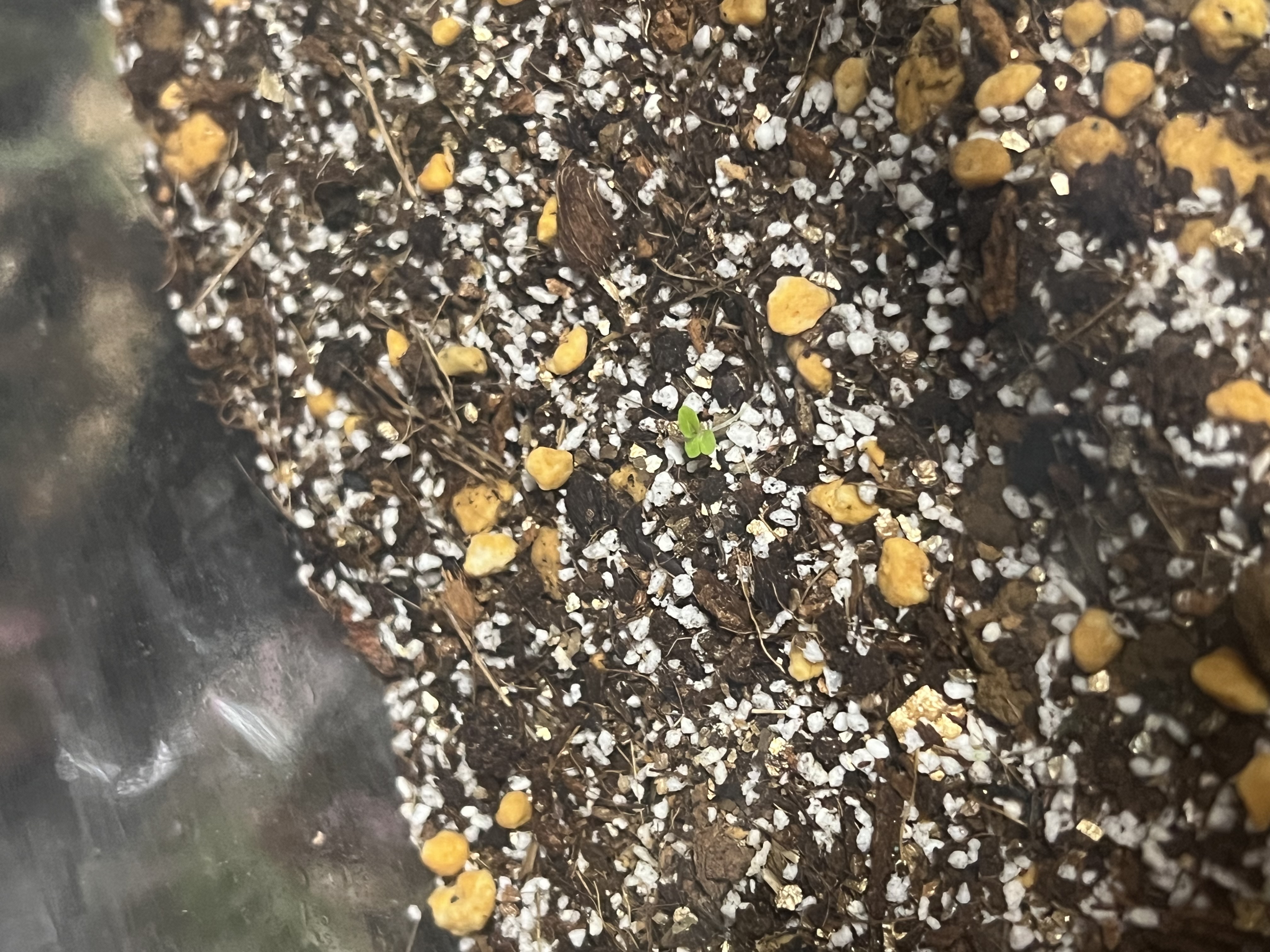[ 播種日 / 撮影日 ]2025/1/20播種 2024/2/23撮影[ 播種数 / 発芽数 ]50粒/ 1粒[ その他(用土や管理方法など)]タッパーに挿し芽種まきの土を敷き、水スプレーで湿らせて播種、ラップで覆い密閉。日中はタイマー付き卓上ライトが当たる所に放置。
