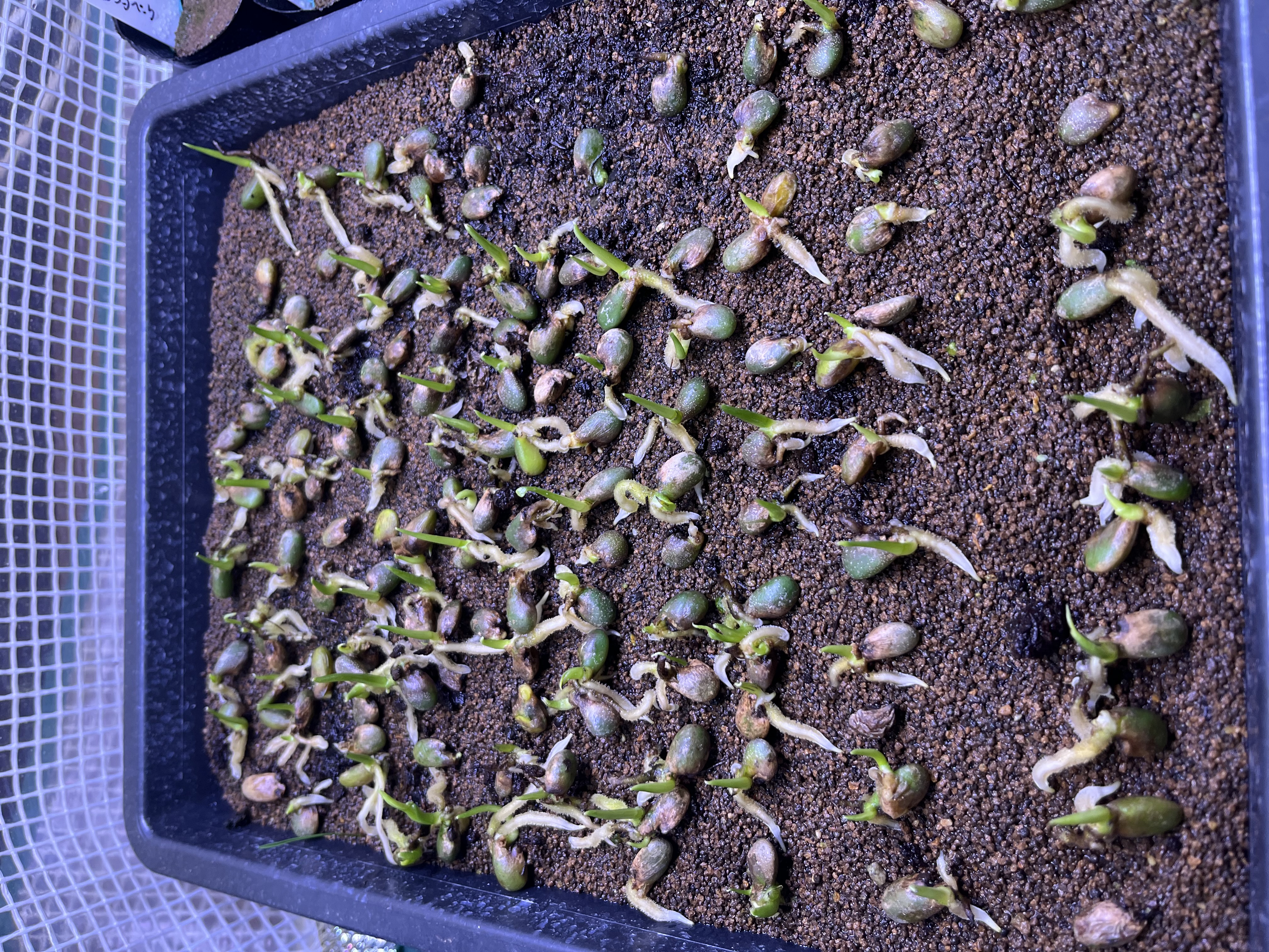 [ 播種日 / 撮影日 ]2025/2/12播種 2025/2/25撮影[ 播種数 / 発芽数 ]100粒/ 100粒(おまけ分も13発芽)[ その他(用土や管理方法など)]播種前にベンレート+メネデール溶液に半日程度浸漬日向土メインの用土に細粒の赤玉土を敷き播種、20度〜25度で管理