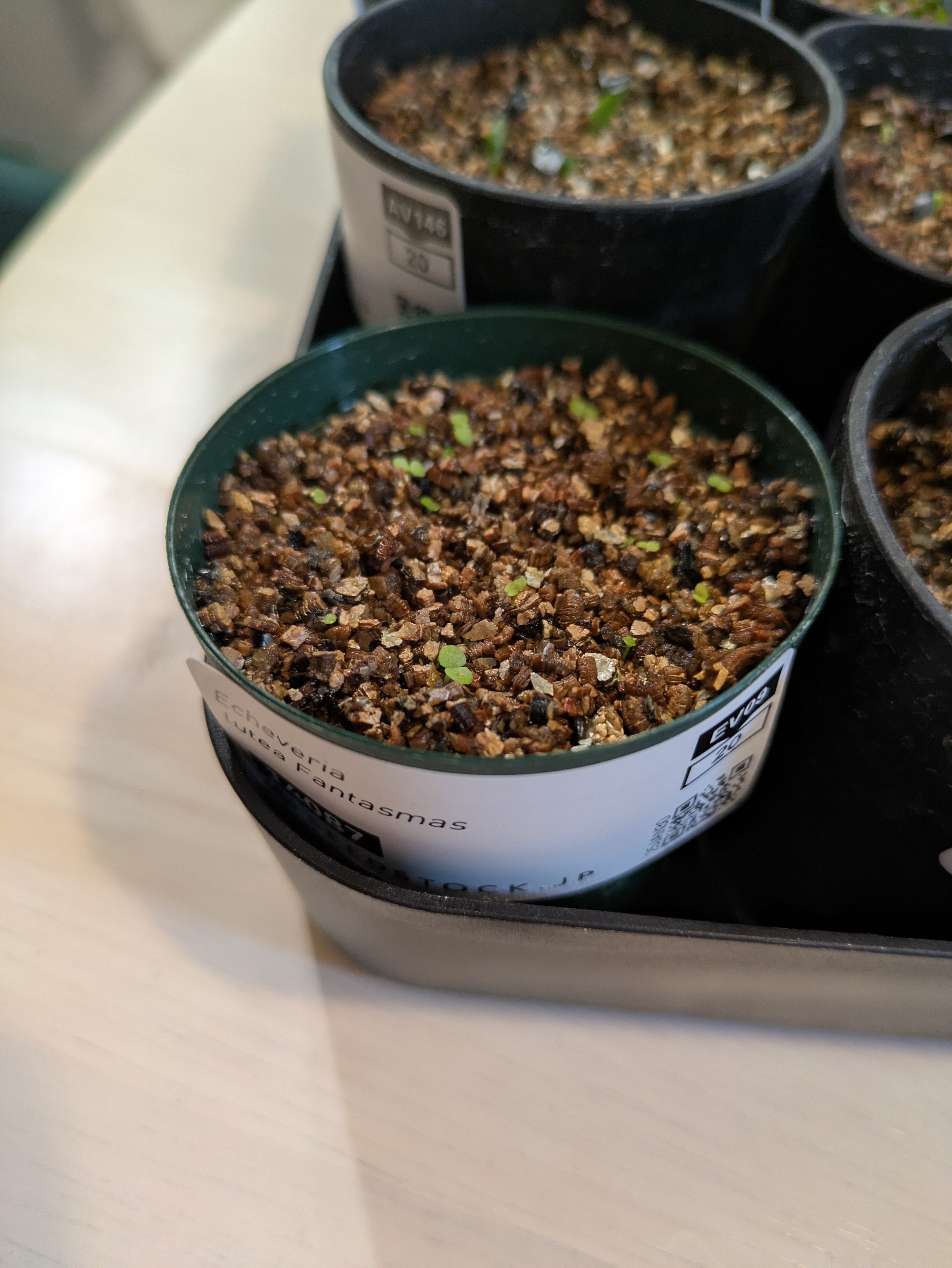 市販の多肉植物用土(無肥料)にバーミキュライトを敷き播種。播種前に用土は熱湯で消毒。