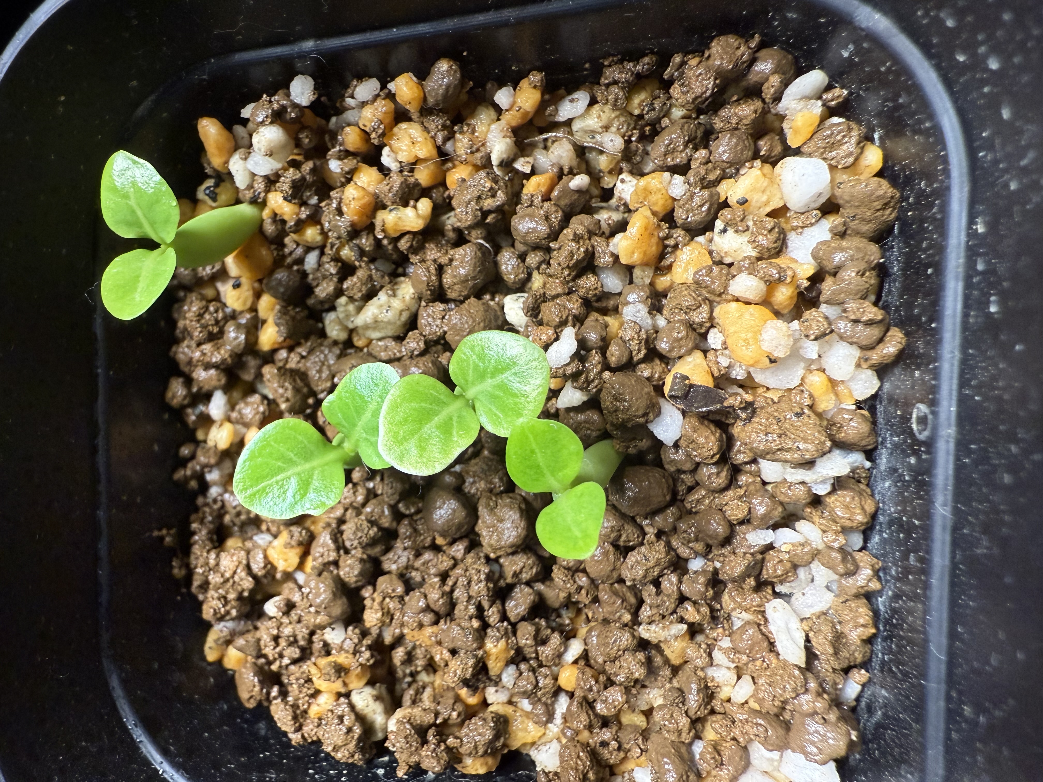 [ 播種日 / 撮影日 ]2025/2/11播種 2025/2/28撮影[ 播種数 / 発芽数 ]5粒/ 4粒播種前にダコニール+メネデール溶液に1日浸漬多肉用の用土と赤玉を煮沸消毒し敷き播種、20度前後で管理