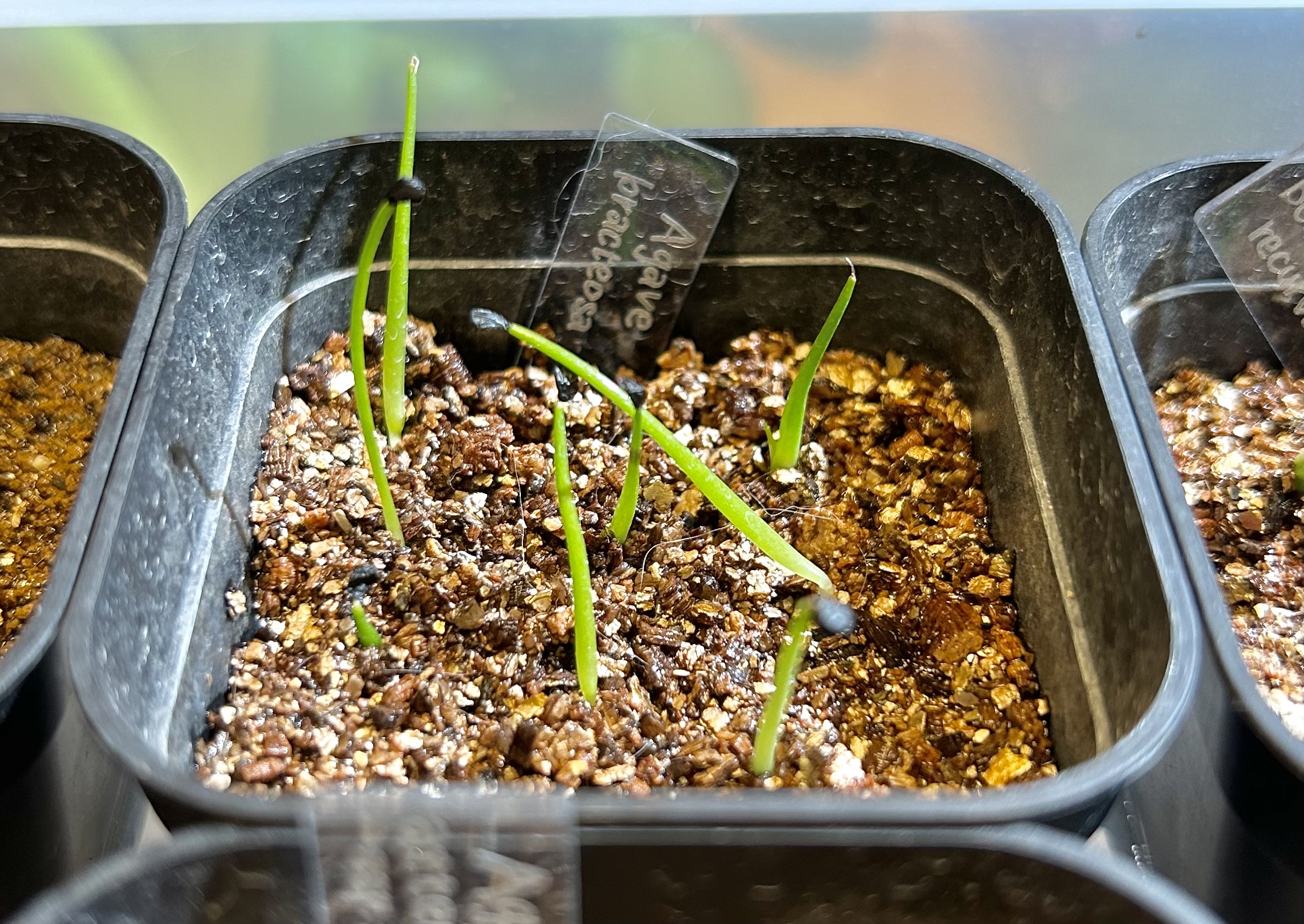 [ 播種日 / 撮影日 ] 2025/1/31播種 2025/3/4撮影[ 播種数 / 発芽数 ] 10粒+α/ 8〜10粒、生育中8粒[ その他(用土や管理方法など)] 播種前にダコニール+メネデール溶液に一晩〜1日程度浸漬赤玉メインの用土にバーミキュライトを敷き播種、ヒーターマット上、密封タッパーでダコニール+メネデール液腰水管理中