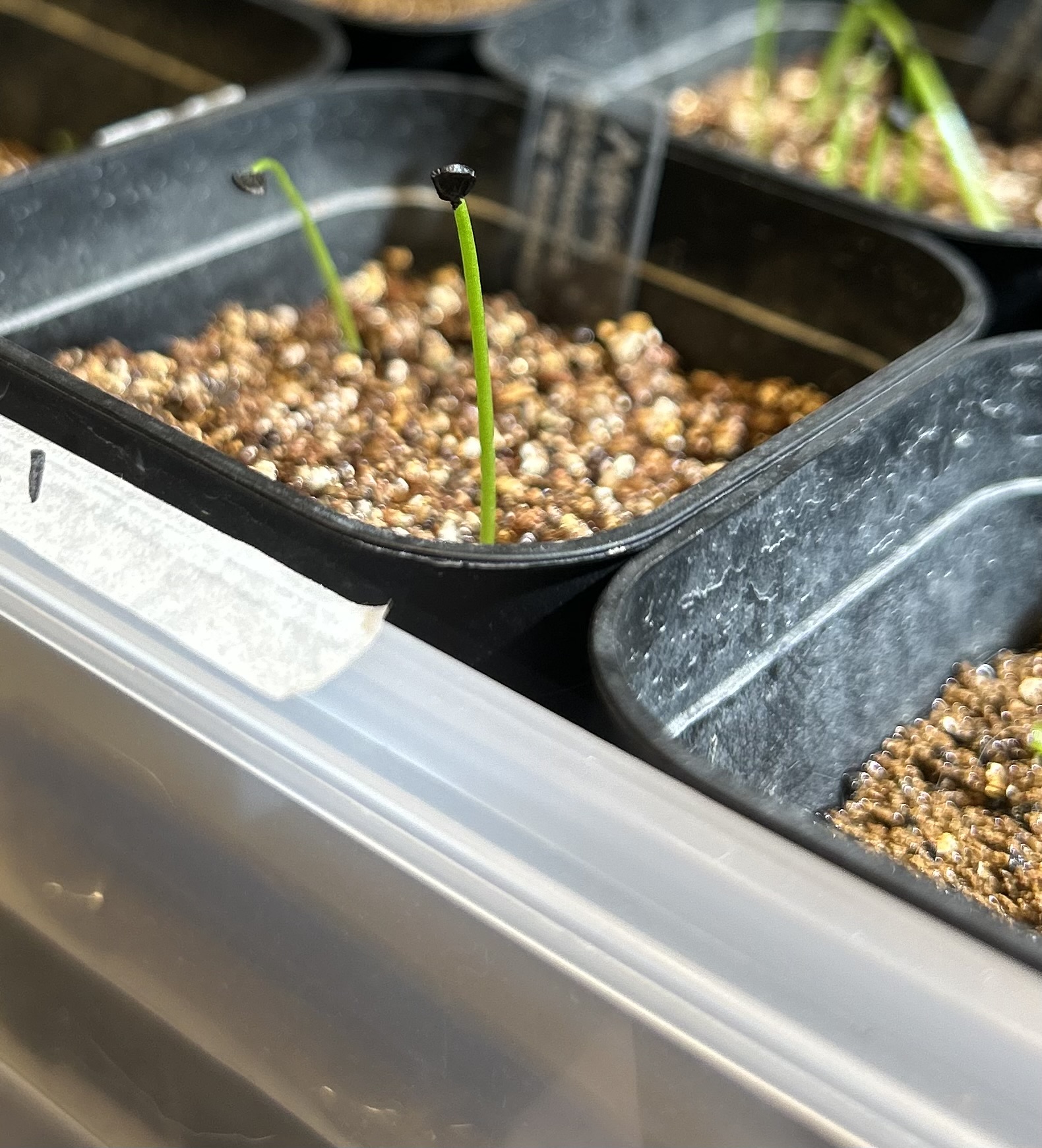 [ 播種日 / 撮影日 ] 2025/1/31播種 2025/3/4撮影[ 播種数 / 発芽数 ] 10粒+α/ 5粒程、生育中2粒[ その他(用土や管理方法など)] 播種前にダコニール+メネデール溶液に一晩〜1日程度浸漬赤玉メインの用土にバーミキュライトを敷き播種、ヒーターマット上、タッパーでダコニール+メネデール液腰水管理中