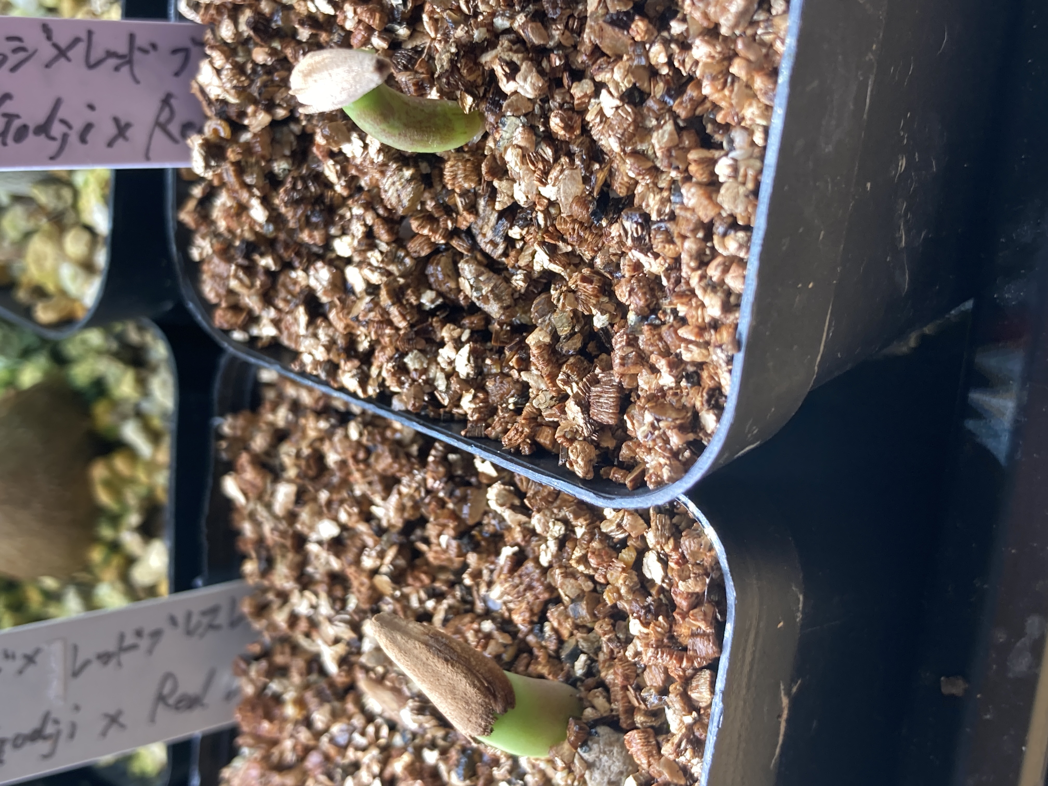 底に軽石を敷き、サボテン・多肉の土を入れて表面にバーミキュライトを敷き播種、ジップロックに入れて15度〜30度で管理