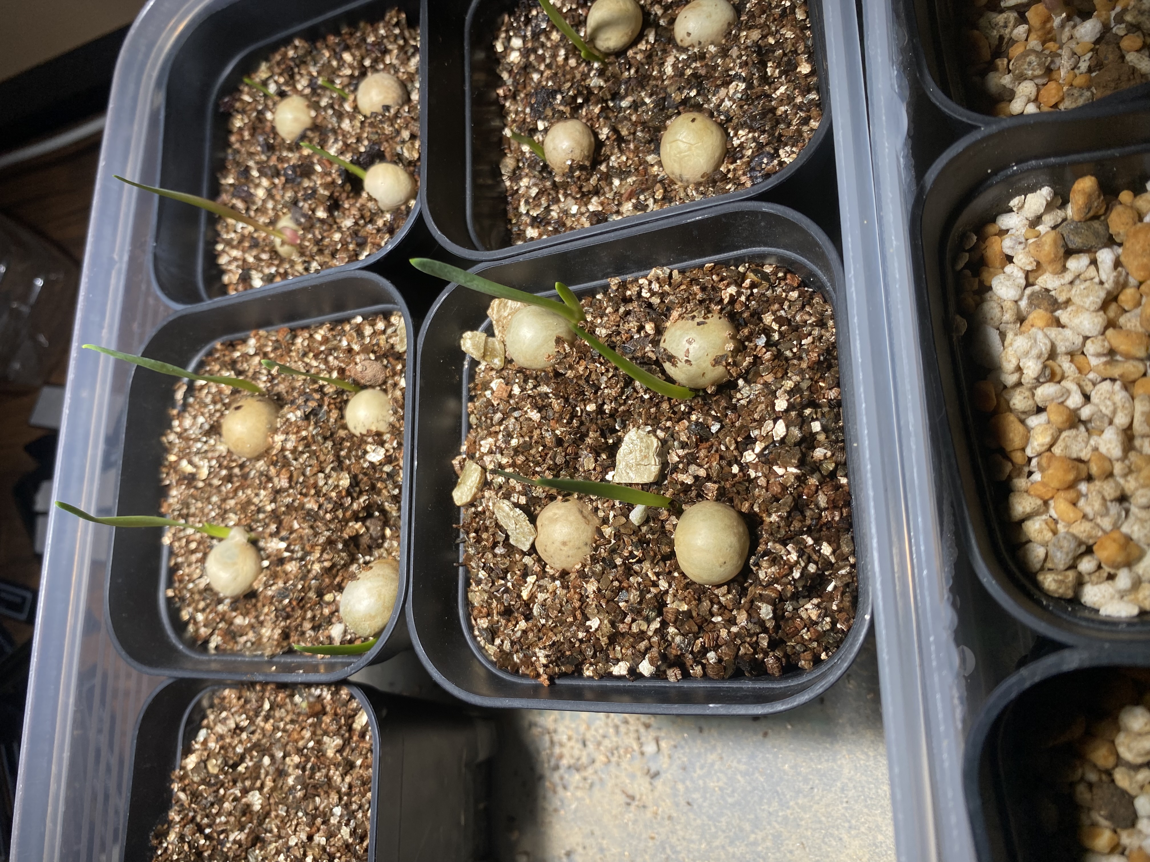 既に根が出ているとのことでしたが、かなり多くのタネをおまけで入れてもらえました。購入数以上の発芽でした。[ その他(用土や管理方法など)]メネデール溶液に20分漬ける赤玉メインの用土に細目のバーミキュライトを敷き播種ヒーターで加温。