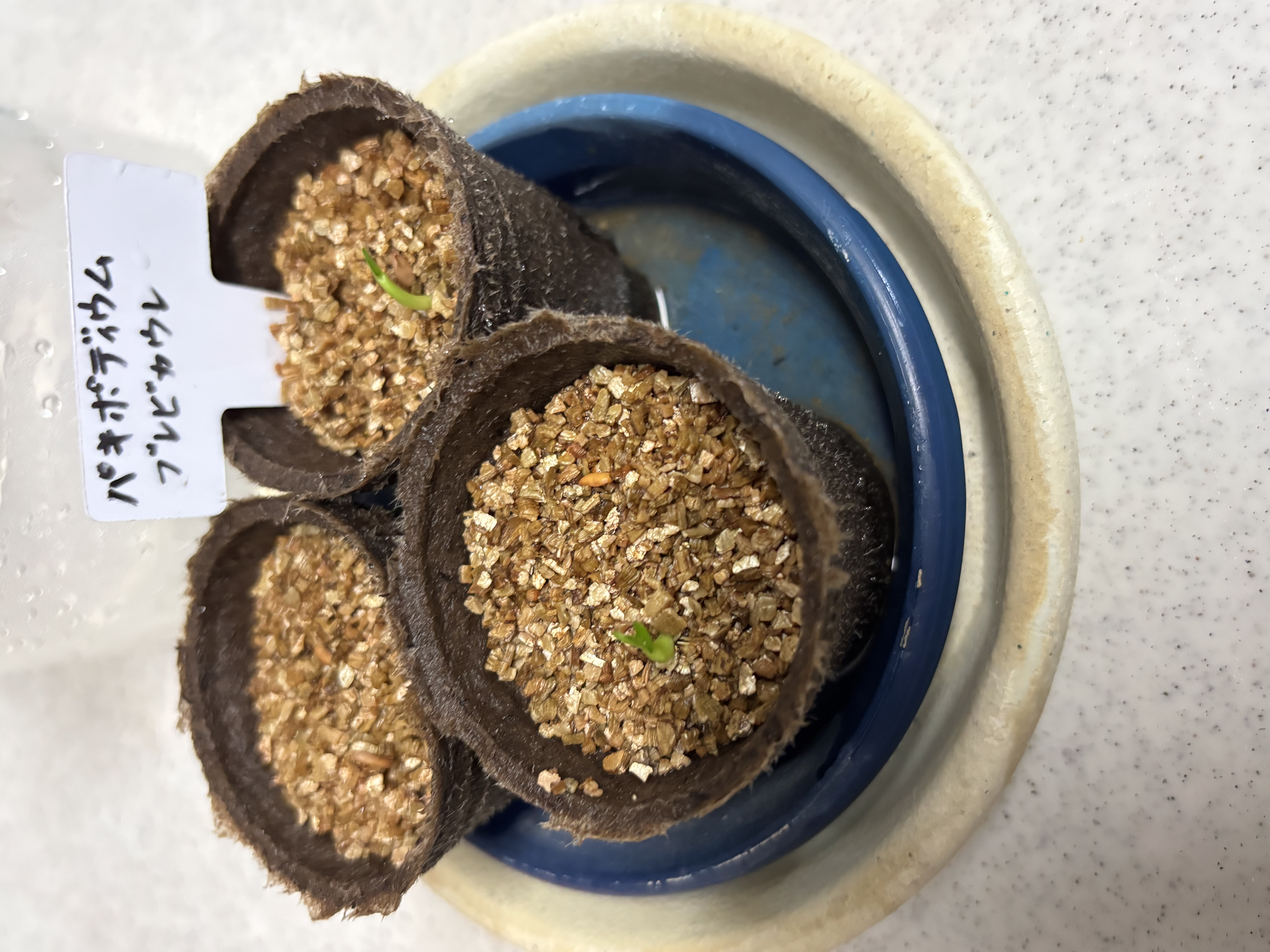 10播種、3発芽 種はベンレート2,000倍溶液に1時間浸漬して、ジフィーポットにネットで土止めして日向土を底に入れ、バーキャミライトを入れてレンジで1分ぐらい加熱して殺菌。トレイにタチガレン2,000倍溶液を入れて腰水にして、ヒーターマットの上において、CDケースで蓋をして簡易温室状態を維持