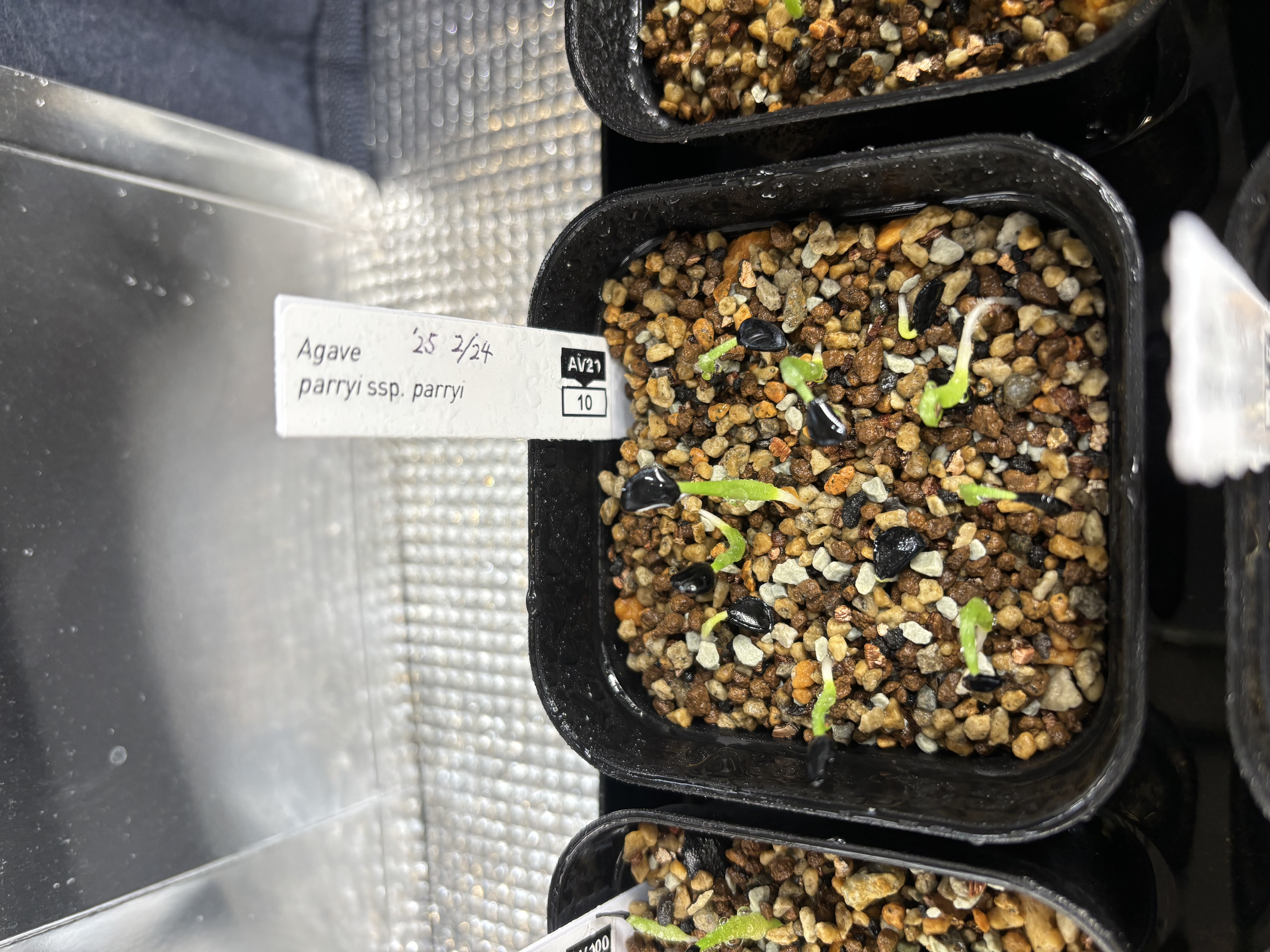 2025.2.24播種 2025.3.6撮影[ 播種数 / 発芽数 ]11粒/ 11粒[ その他(用土や管理方法など)]・播種前にベンレート1000倍希釈+メネデール100倍希釈溶液に24時間浸漬・用土はアガベや塊根植物に使用するような無機質系の用土、その上に細粒の赤玉+バーミキュライト