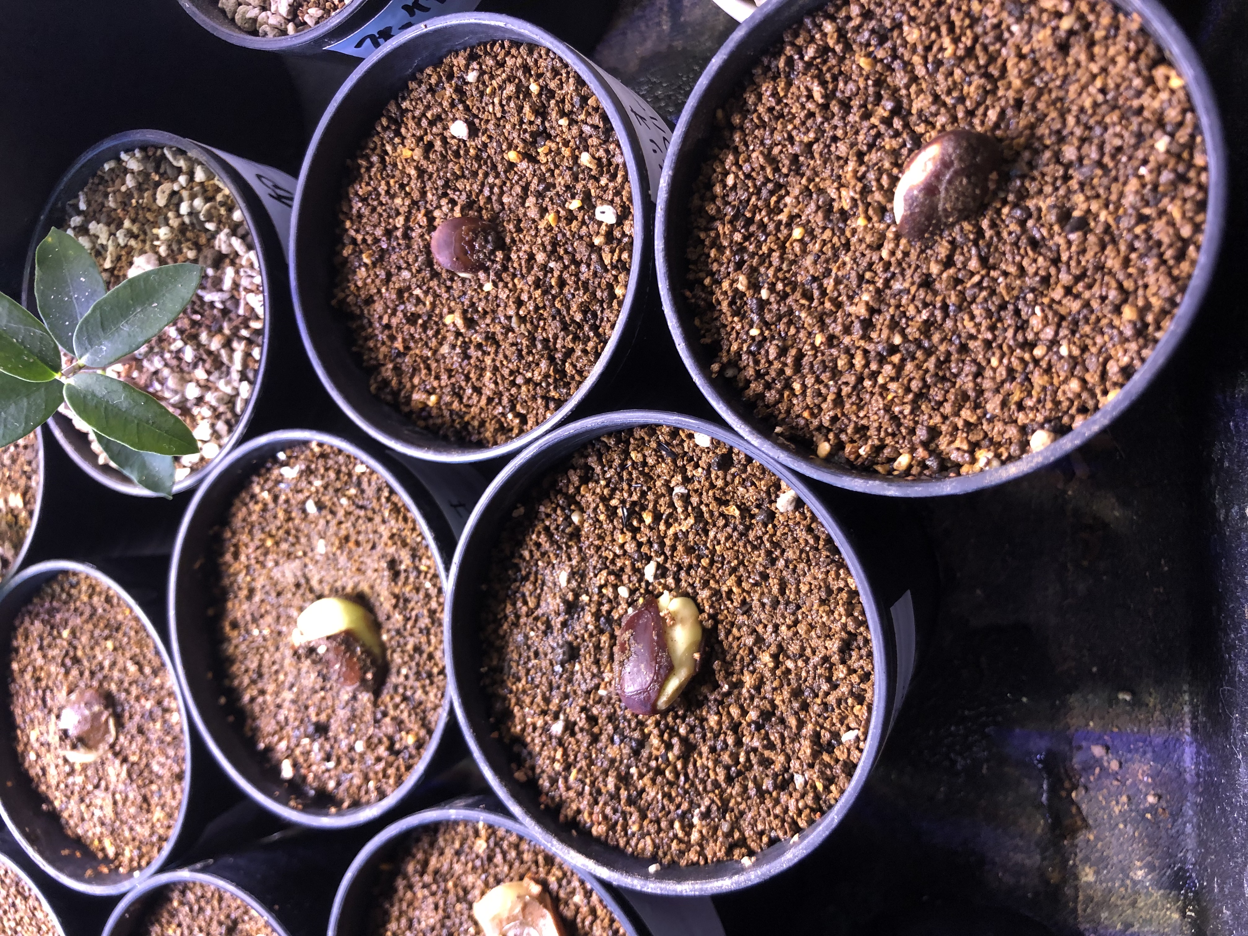 胚を傷つけつけないように殻の反対側を傷つけて中身を露出させ、ベンレートとメネデールを入れた水に24時間浸水。赤玉細粒を入れた鉢(腰水)に種を置いてラップで保湿し室内保管。