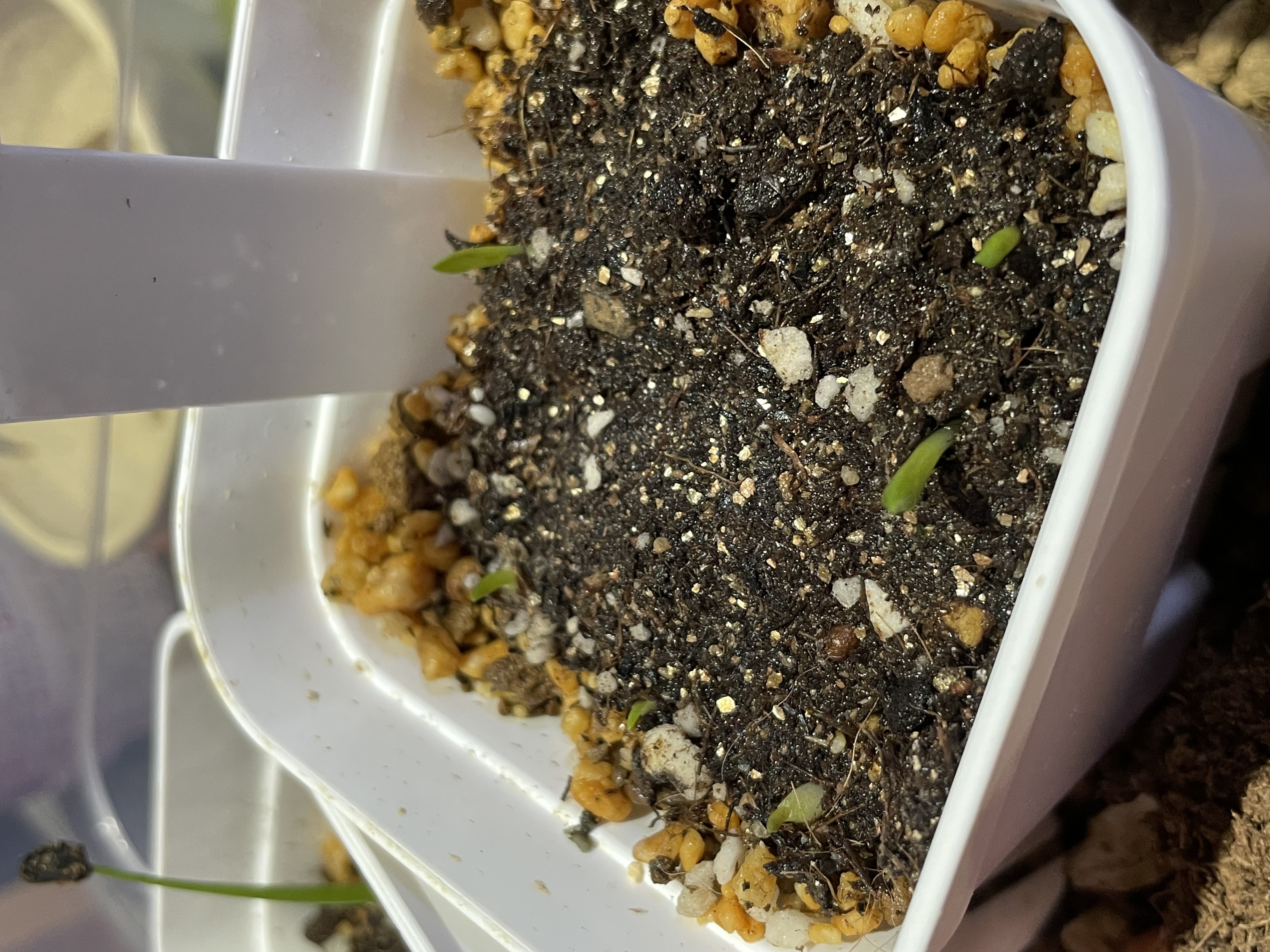 用土は赤玉土、鹿沼土、バーライトをテキトーに混ぜた土で、表面にひとつまみ市販の種まき培土を載せています。