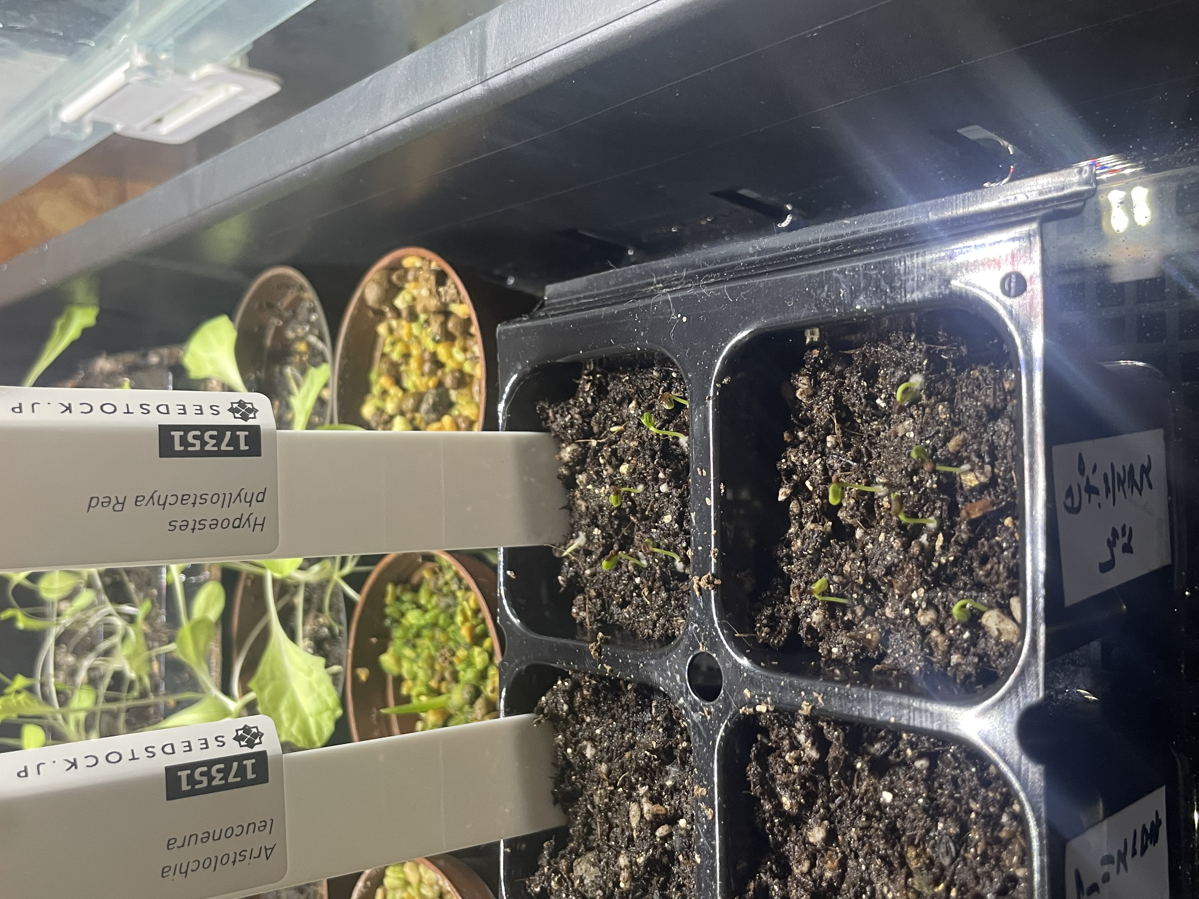 熱帯魚用のLEDライト下に透明カバー付きの育苗トレーで腰水管理しております。