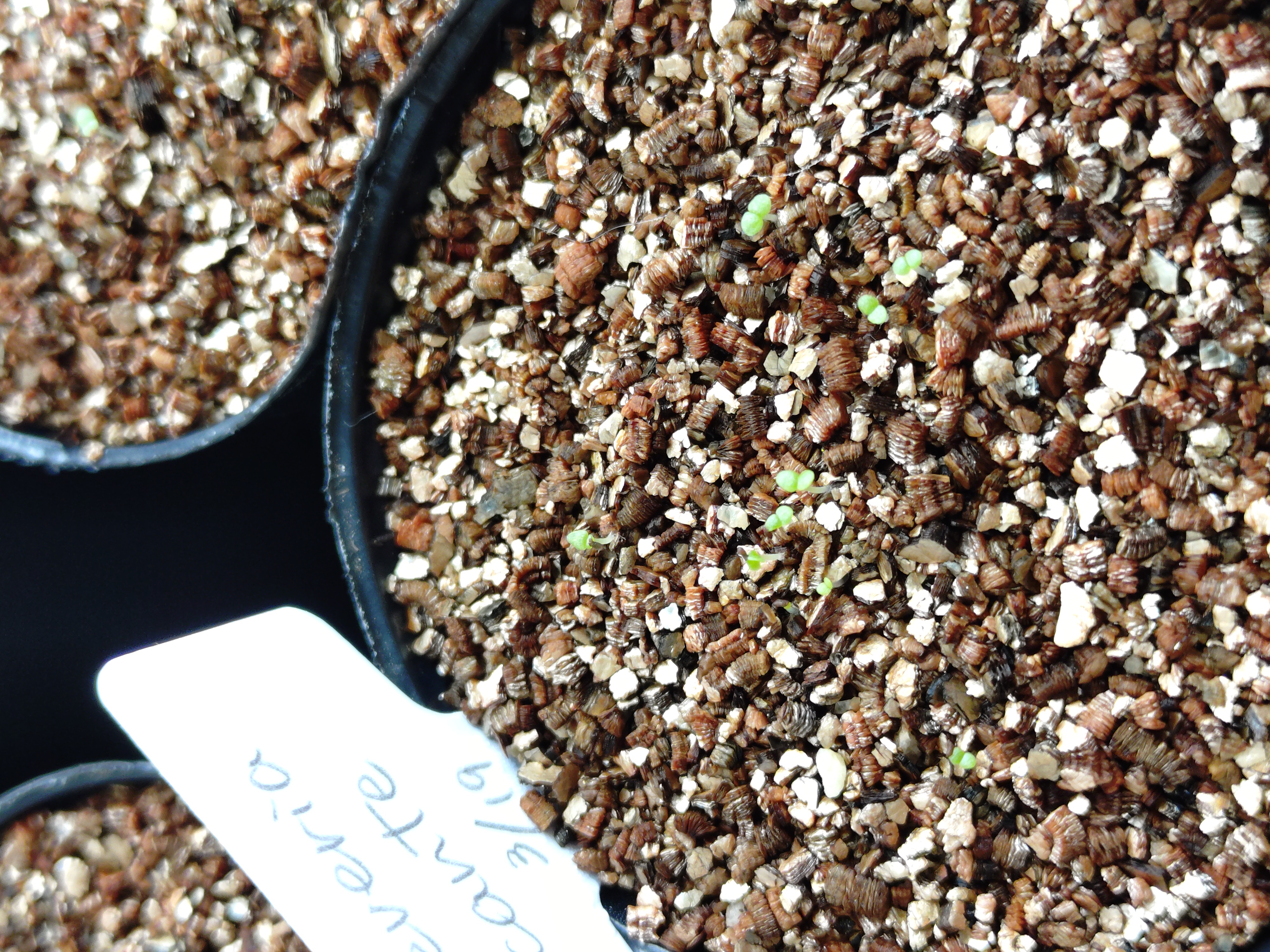 軽石細粒、鹿沼土細粒、ピートモス、バーミキュライトの混合土にバーミキュライトを敷き詰めて播種