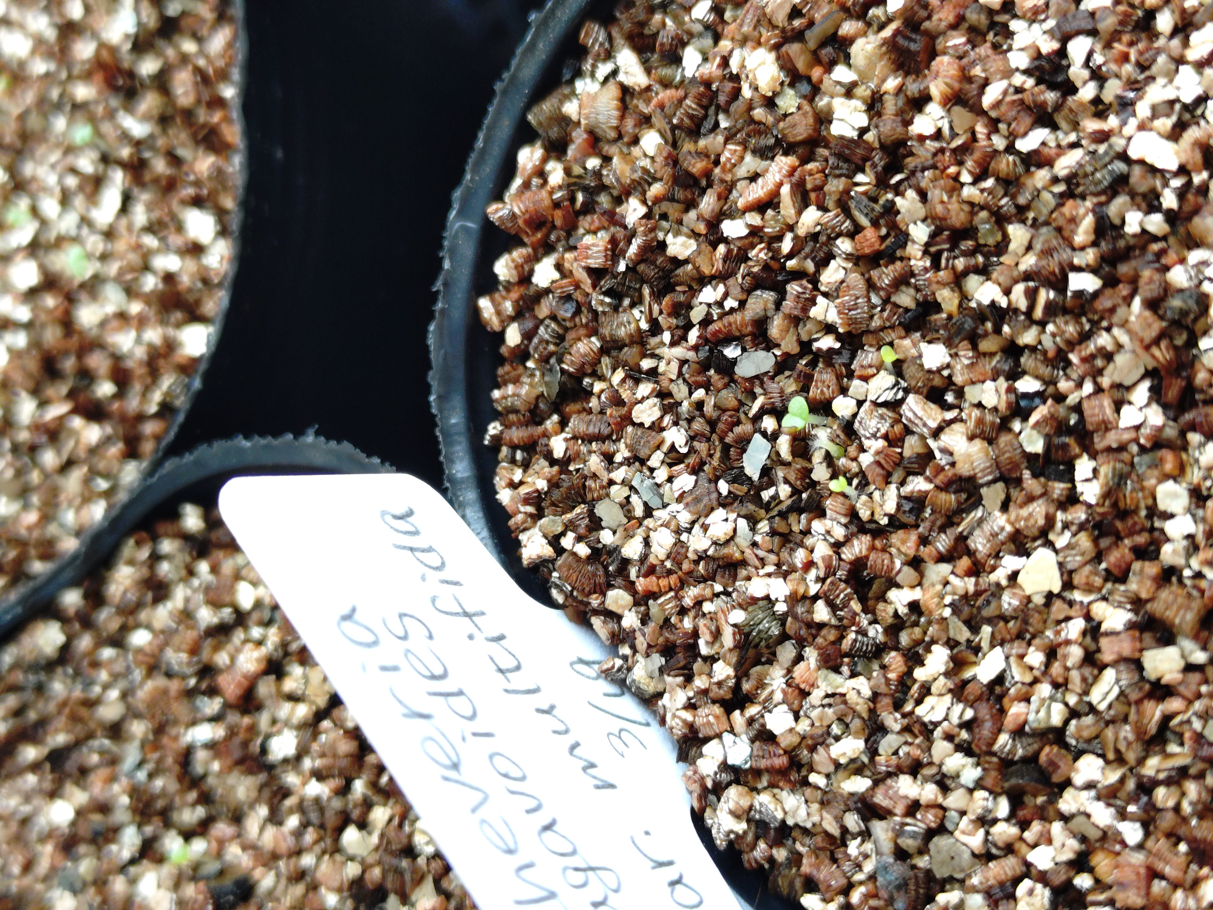 軽石細粒、鹿沼土細粒、ピートモス、バーミキュライトの混合土にバーミキュライトを敷き詰めて播種