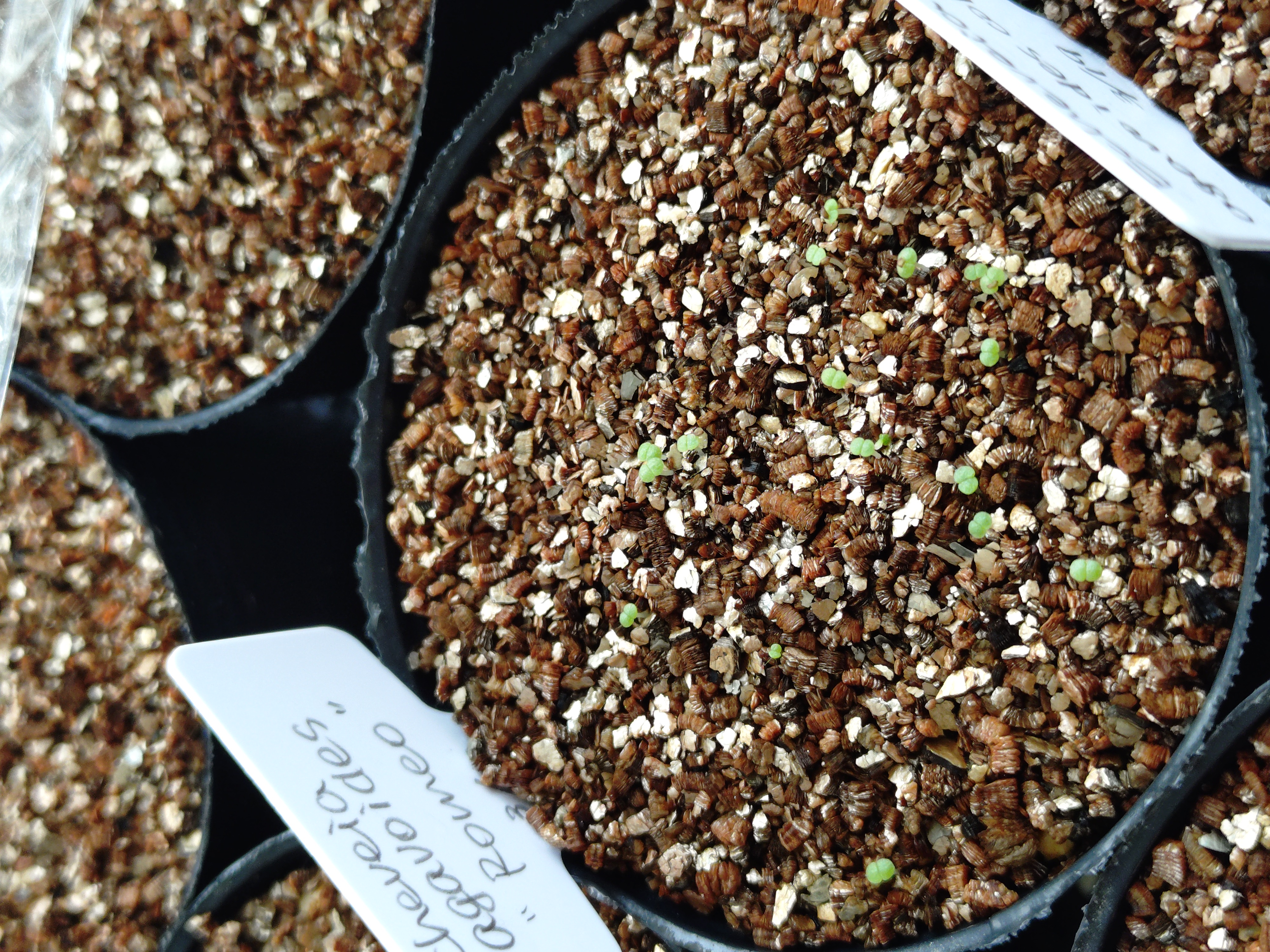 軽石細粒、鹿沼土細粒、ピートモス、バーミキュライトの混合土にバーミキュライトを敷き詰めて播種