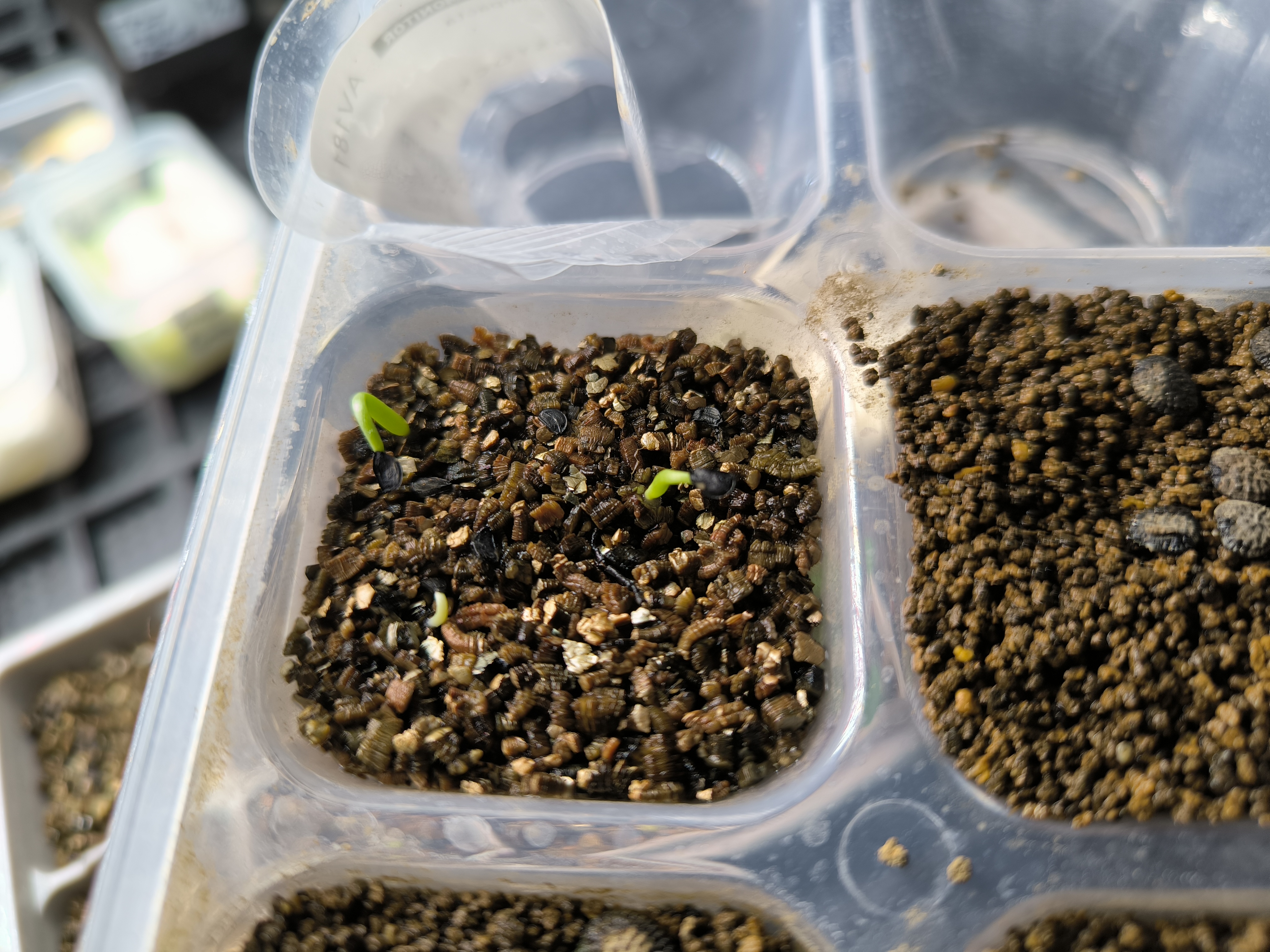 ダイソーの製氷皿にバーミキュライトを敷いて播種(覆土、保湿カバー無し)。