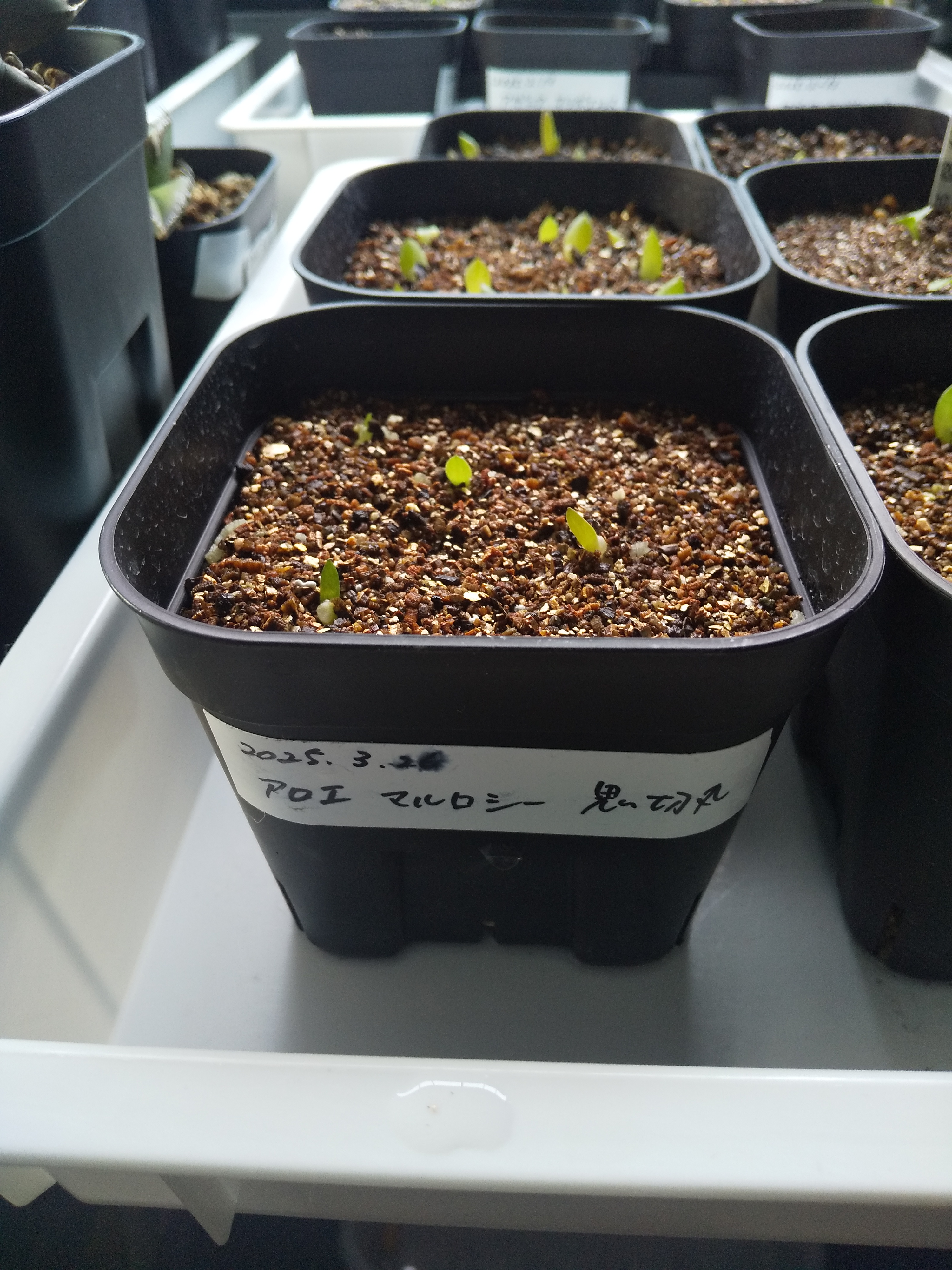 赤玉メインの用土に細目のバーミキュライトを敷き播種、20度〜25度で管理