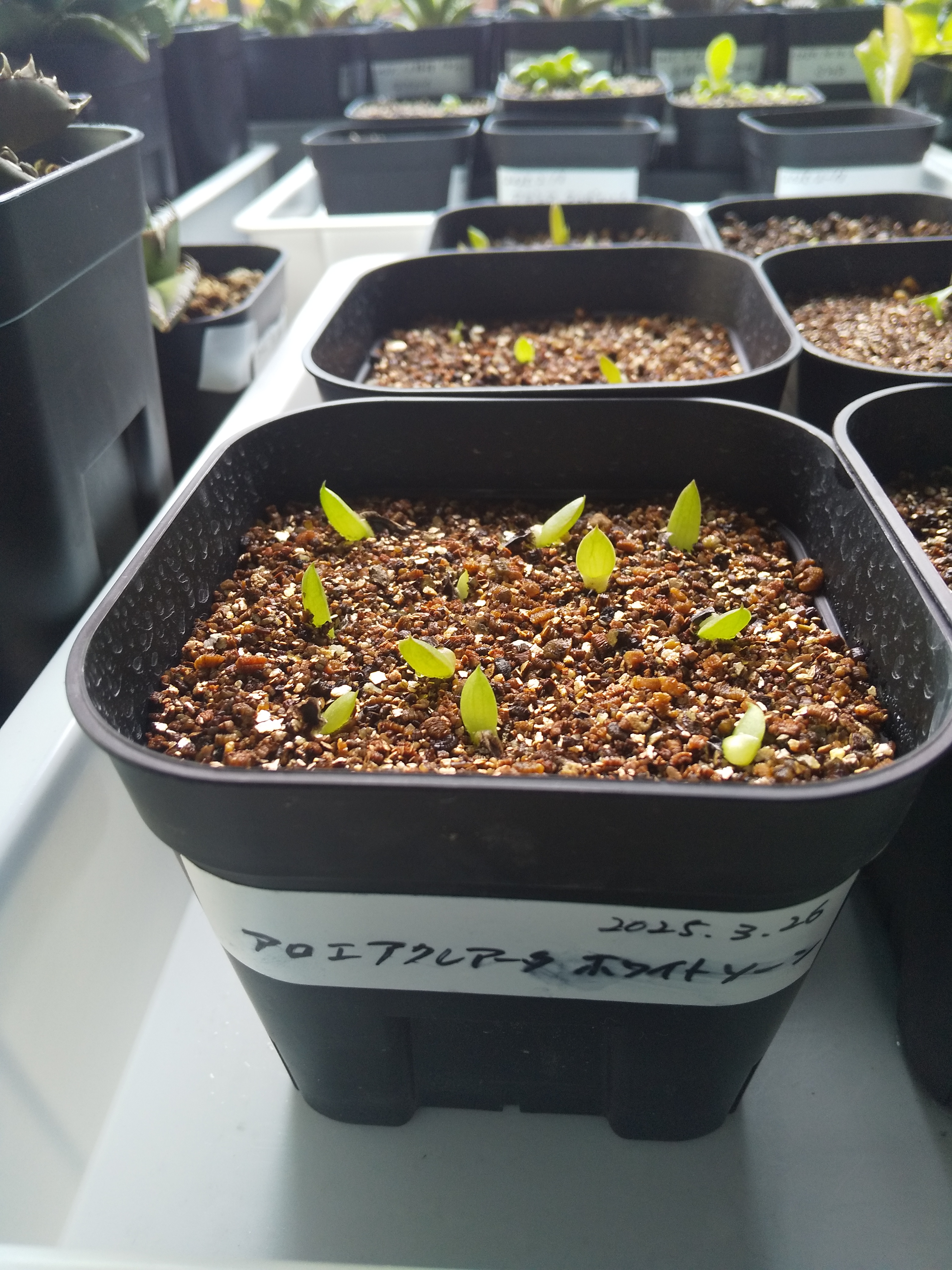 赤玉メインの用土に細目のバーミキュライトを敷き播種、20度〜25度で管理