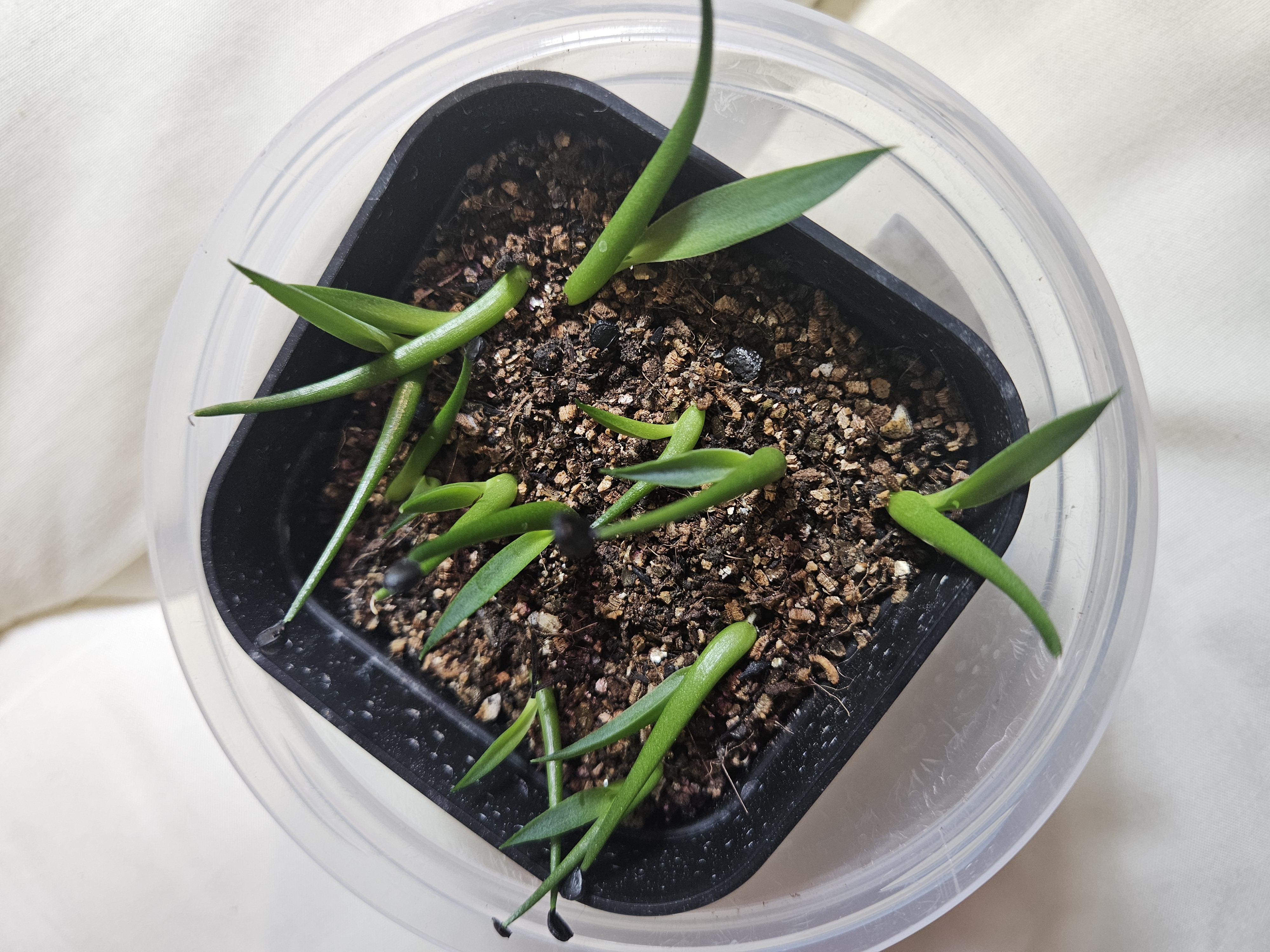 発芽までプレステラをタッパーに入れ、蓋を閉めて室内にて腰水管理。ある程度発芽したら蓋を外して腰水。現在は乾いたら水やり。たまに液肥+活力剤