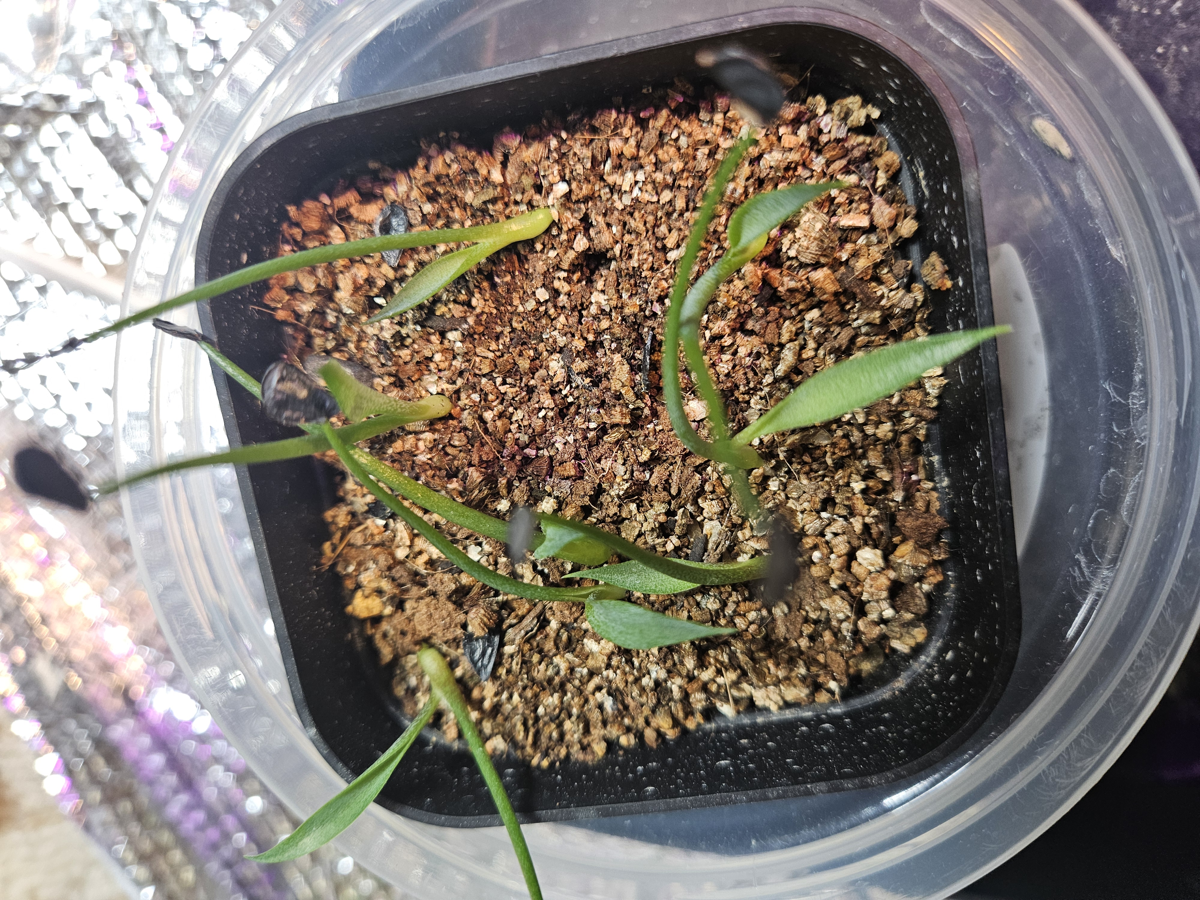 発芽までプレステラをタッパーに入れ、蓋を閉めて室内にて腰水管理。ある程度発芽したら蓋を外して腰水。現在は乾いたら水やり。たまに液肥+活力剤