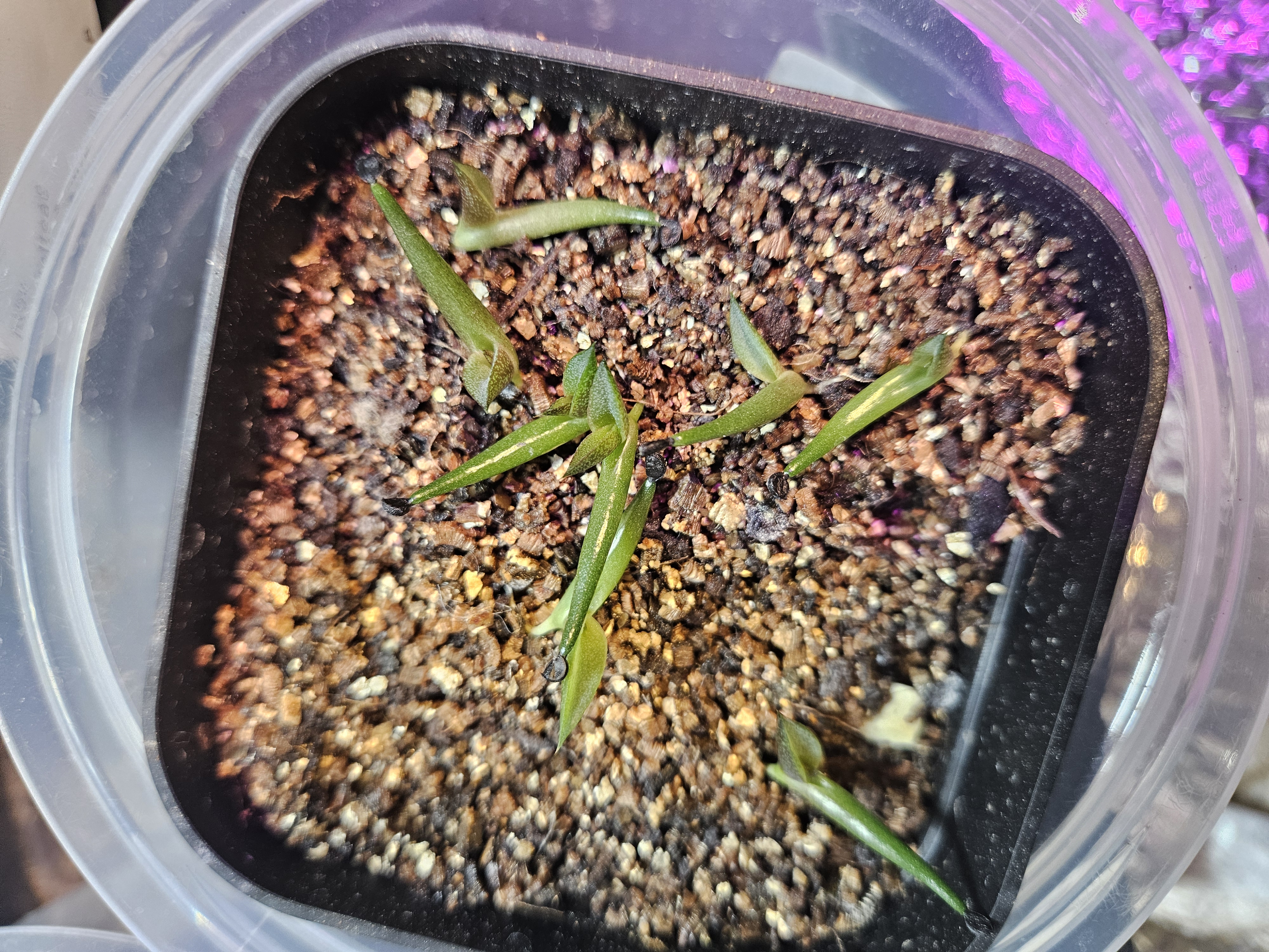 発芽までプレステラをタッパーに入れ、蓋を閉めて室内にて腰水管理。ある程度発芽したら蓋を外して腰水。現在は乾いたら水やり。たまに液肥+活力剤