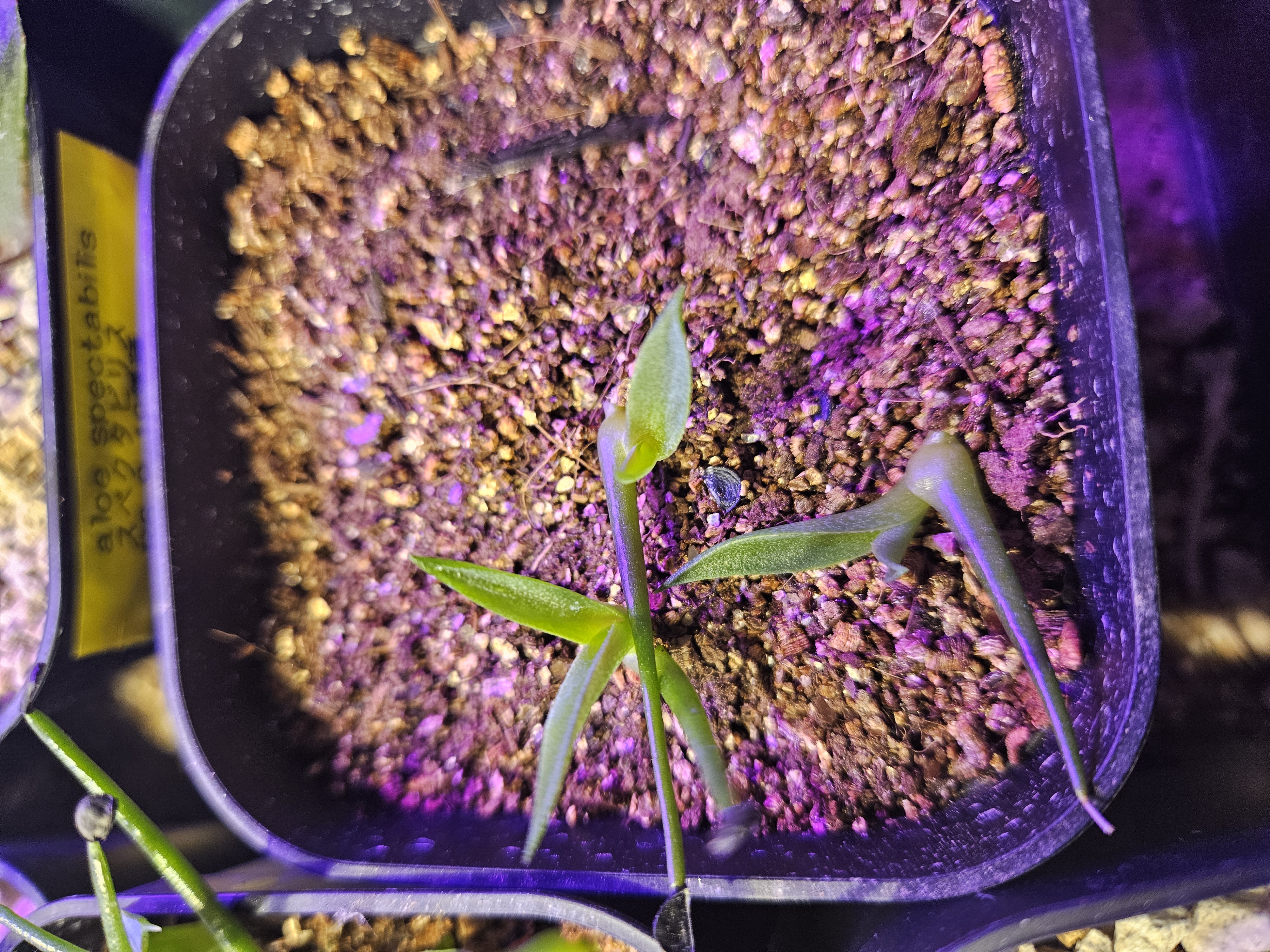 発芽までプレステラをタッパーに入れ、蓋を閉めて室内にて腰水管理。ある程度発芽したら蓋を外して腰水。現在は乾いたら水やり。たまに液肥+活力剤