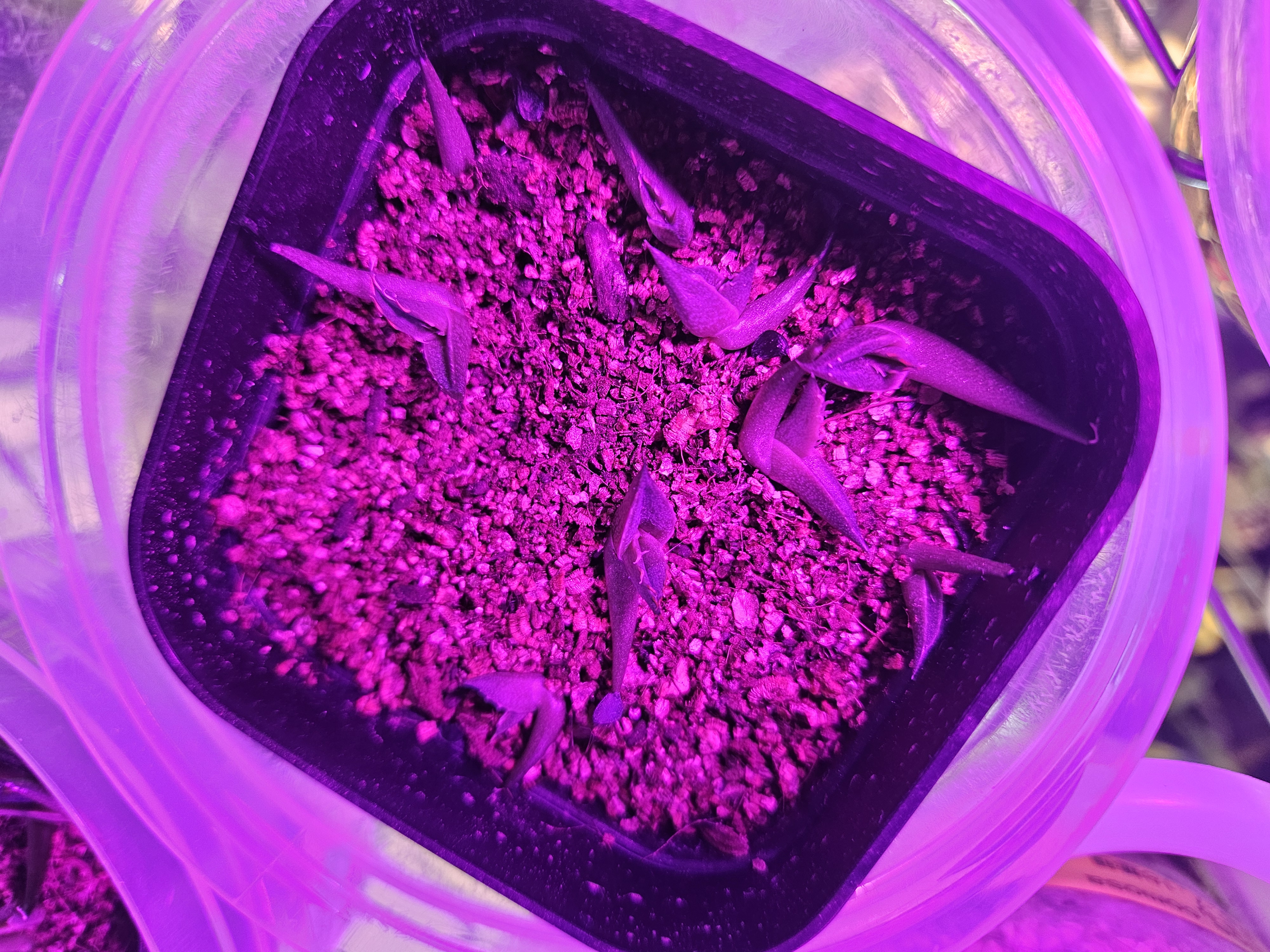 発芽までプレステラをタッパーに入れ、蓋を閉めて室内にて腰水管理。ある程度発芽したら蓋を外して腰水。現在は乾いたら水やり。たまに液肥+活力剤