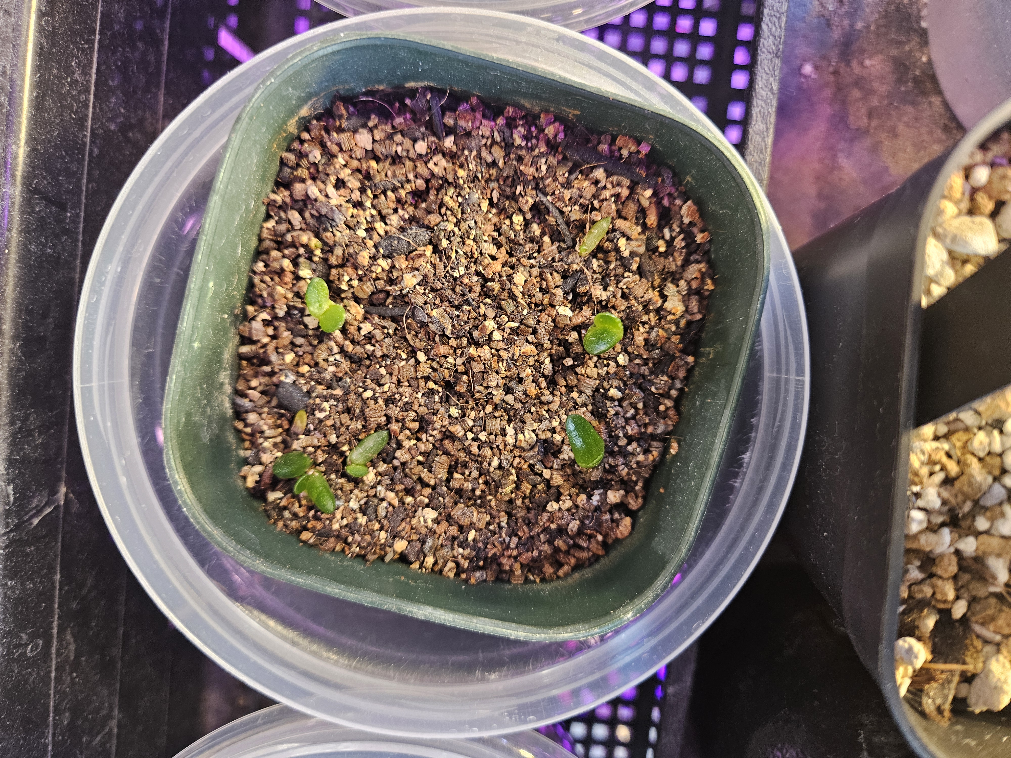 発芽までプレステラをタッパーに入れ、蓋を閉めて室内にて腰水管理。ある程度発芽したら蓋を外して腰水。現在は乾いたら水やり。たまに液肥+活力剤