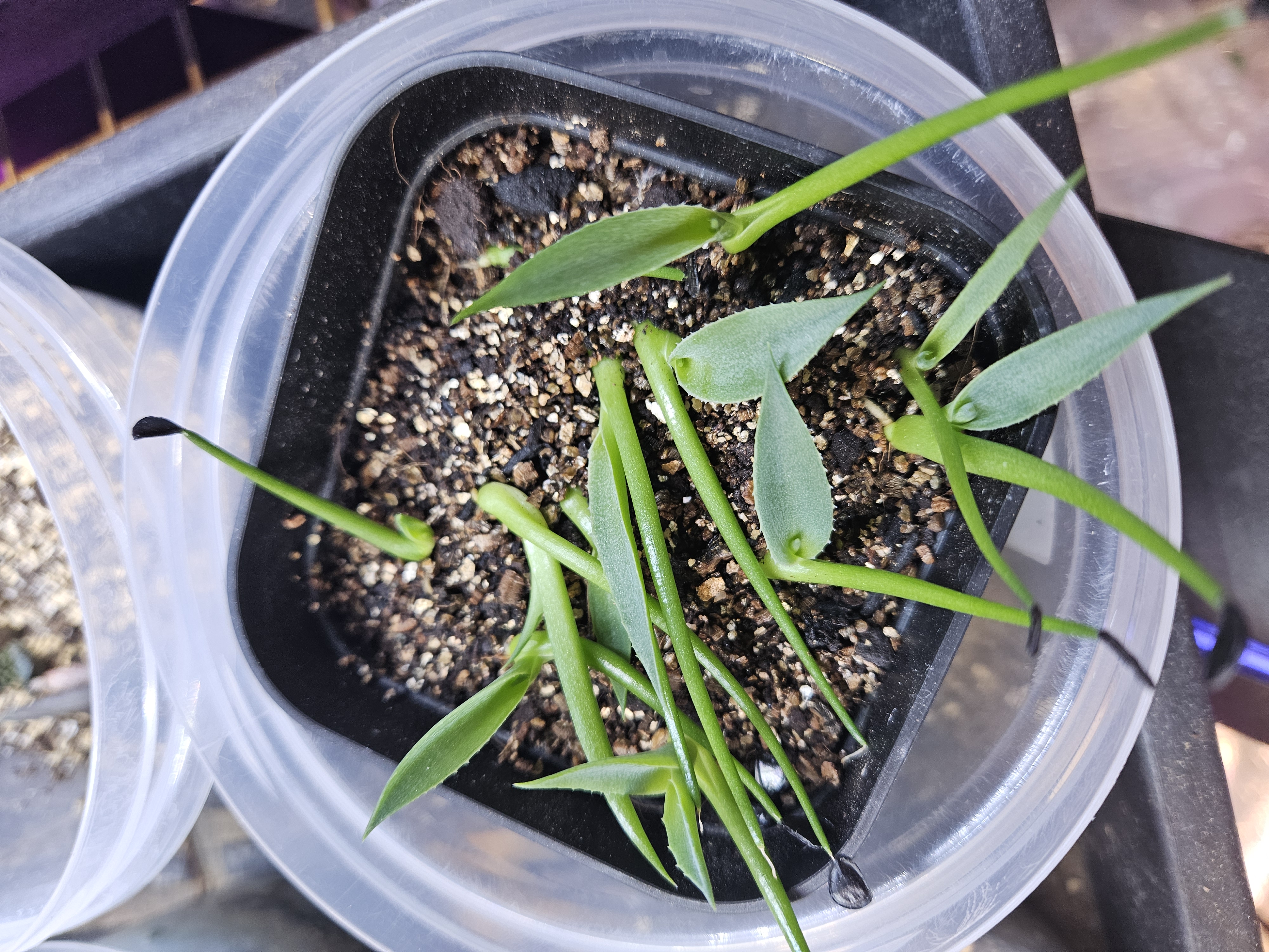 発芽までプレステラをタッパーに入れ、蓋を閉めて室内にて腰水管理。ある程度発芽したら蓋を外して腰水。現在は乾いたら水やり。たまに液肥+活力剤