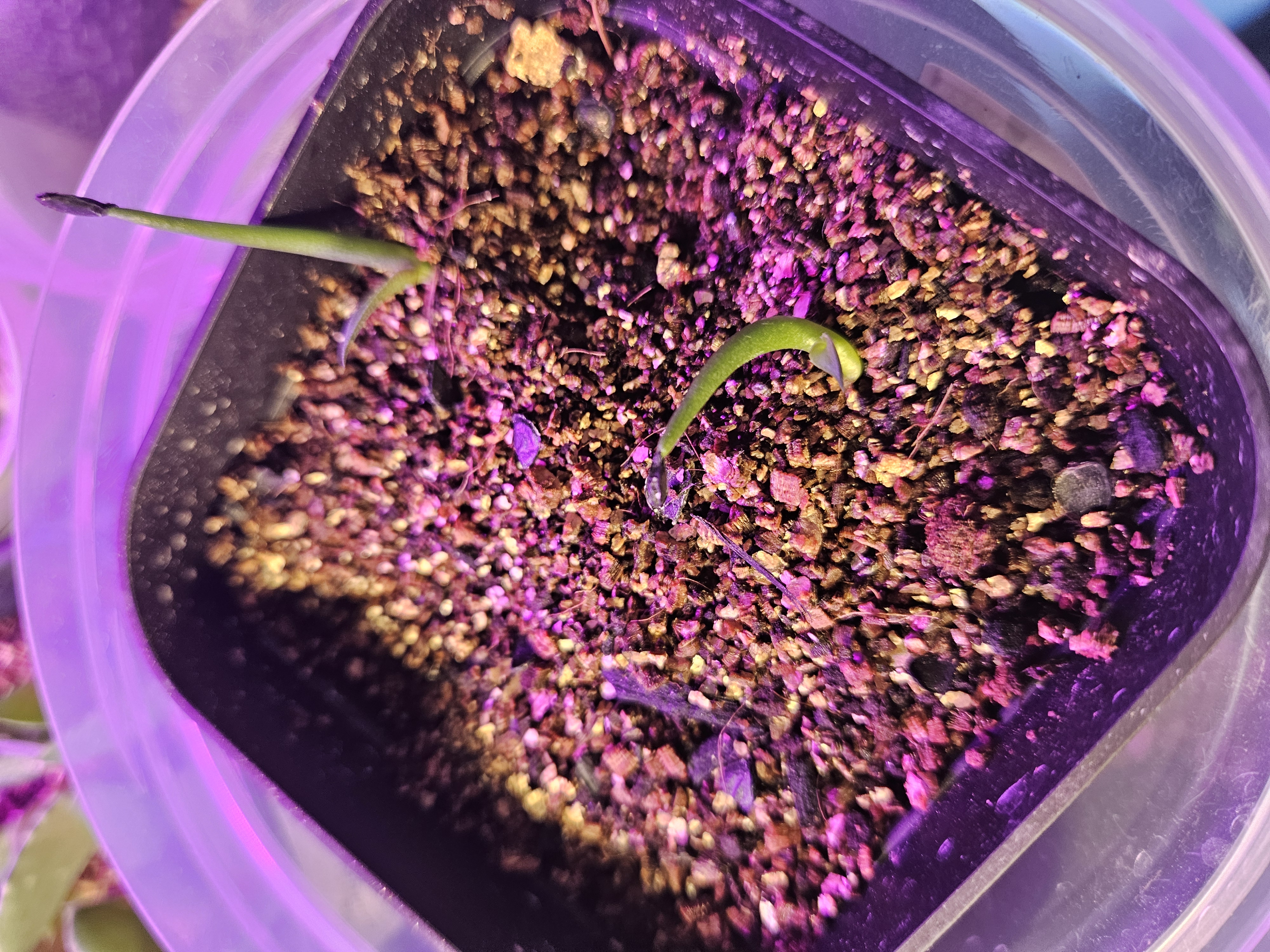 発芽までプレステラをタッパーに入れ、蓋を閉めて室内にて腰水管理。ある程度発芽したら蓋を外して腰水。現在は乾いたら水やり。たまに液肥+活力剤