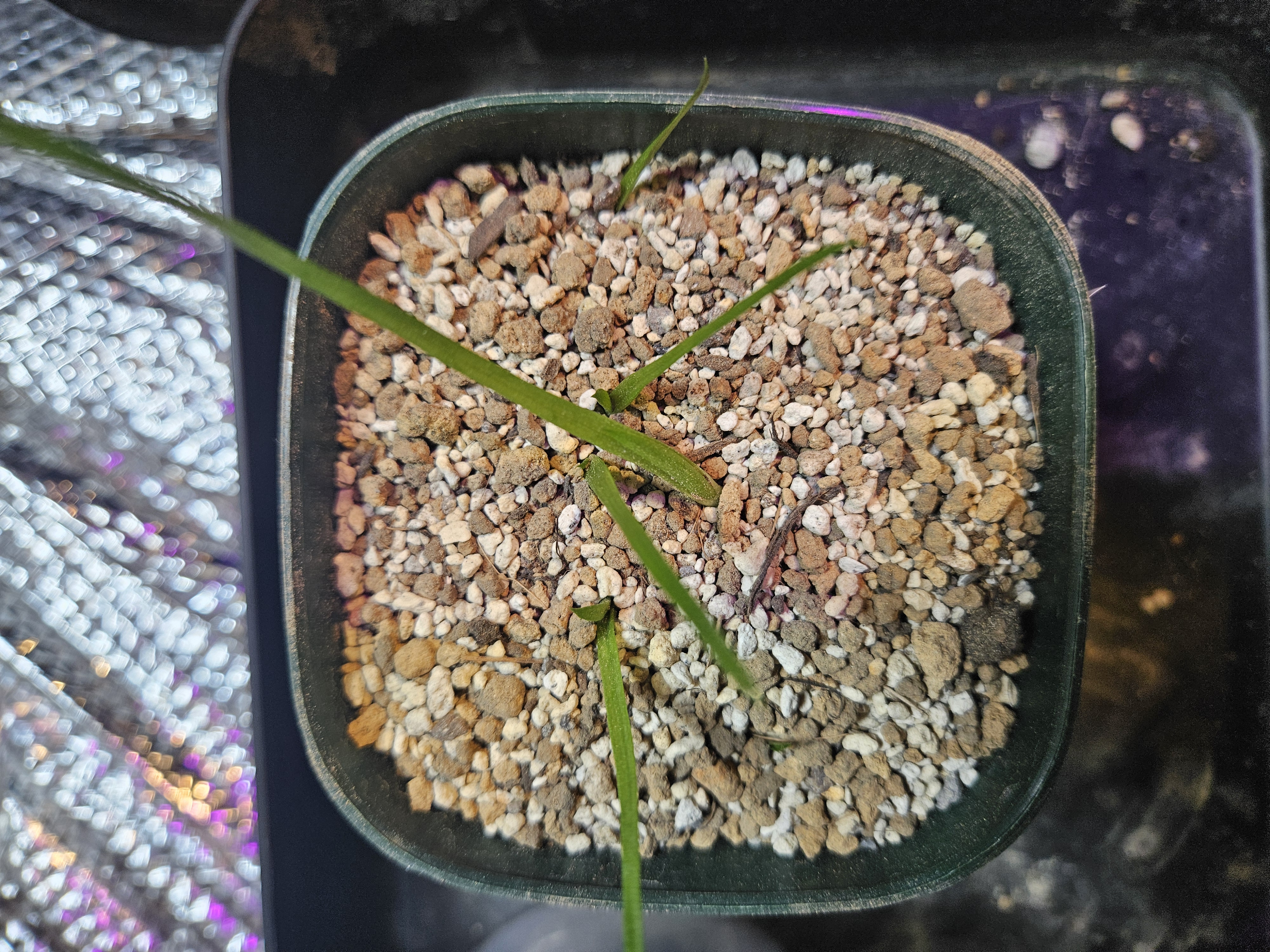 発芽までプレステラをタッパーに入れ、蓋を閉めて室内にて腰水管理。ある程度発芽したら蓋を外して腰水。現在は乾いたら水やり。たまに液肥+活力剤