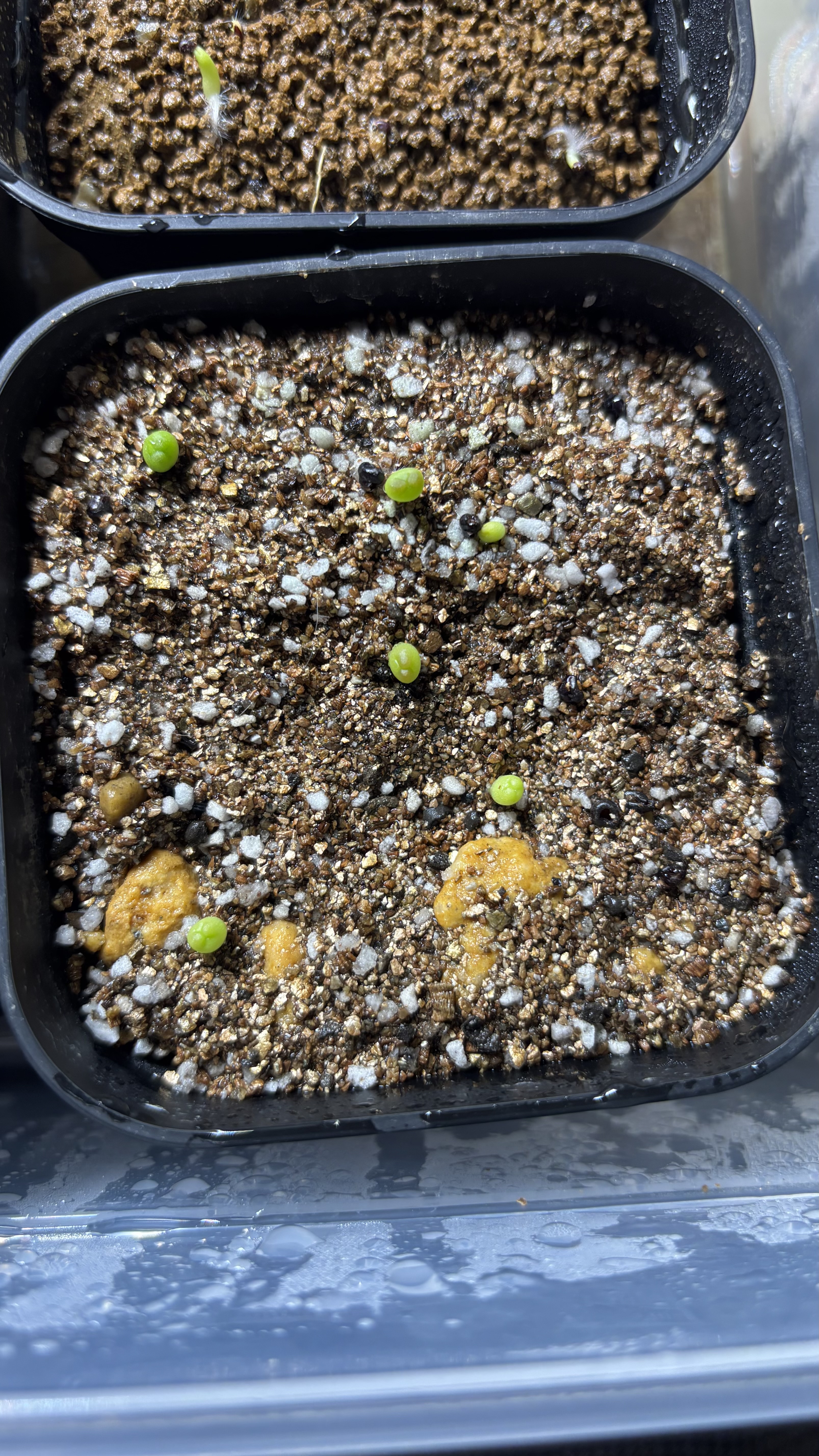 2025/4/2播種 2025/4/8撮影[ 播種数 / 発芽数 ]6粒/ 10粒[ その他(用土や管理方法など)]播種前にベンレート溶液(2000倍希釈)とメネデール(キャップ1/4杯)の混合液に1日浸漬しました。用土(表面は赤玉土極細粒,中底面は一般的な多肉用土)に種を蒔き、半透明の蓋をして腰水管理をしました。