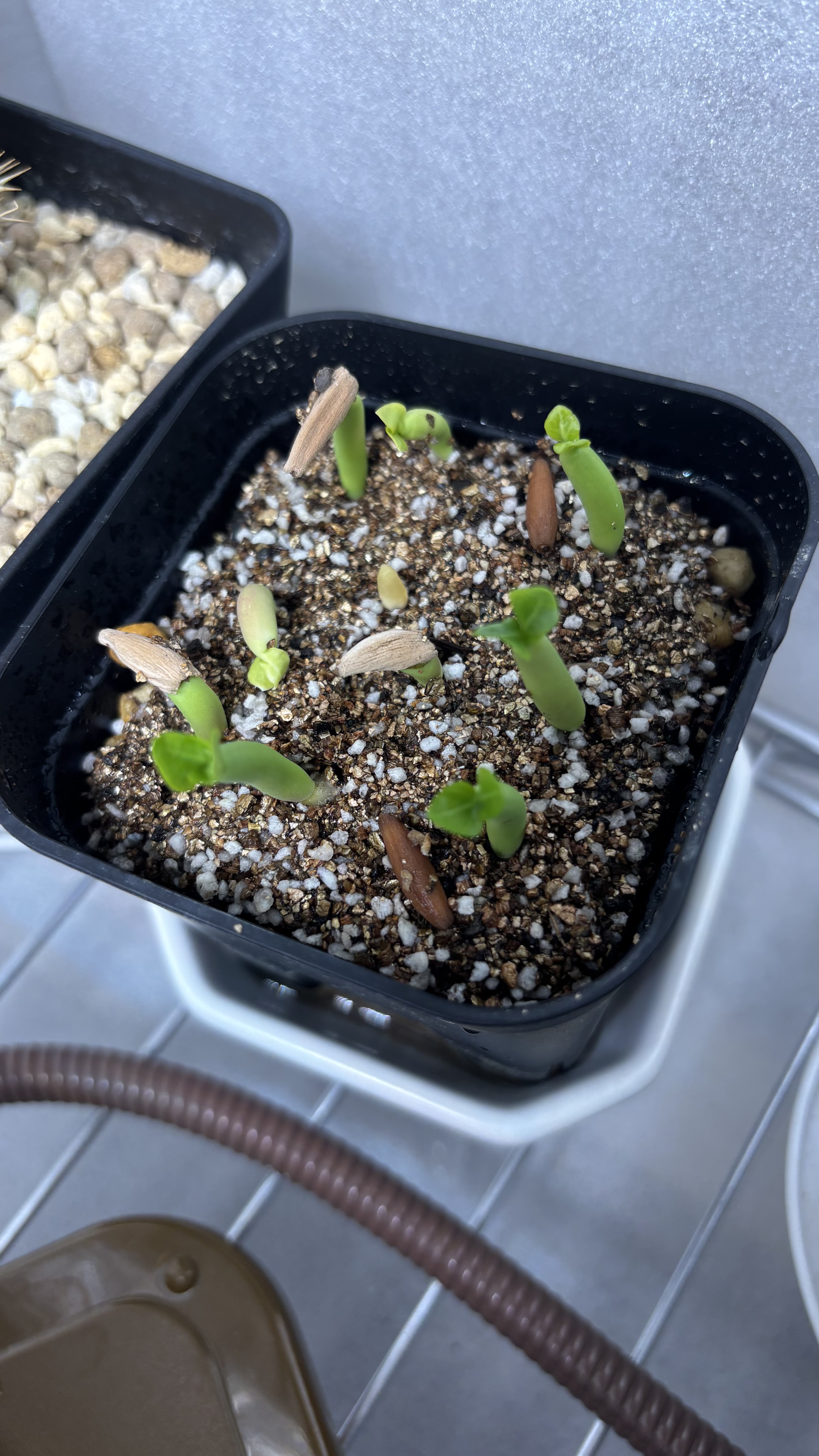 2025/4/2播種 2025/4/8撮影[ 播種数 / 発芽数 ]9粒/ 12粒[ その他(用土や管理方法など)]播種前にベンレート溶液(2000倍希釈)とメネデール(キャップ1/4杯)の混合液に1日浸漬しました。用土(表面は赤玉土極細粒,中底面は一般的な多肉用土)に種を蒔き、半透明の蓋をして腰水管理をしました。