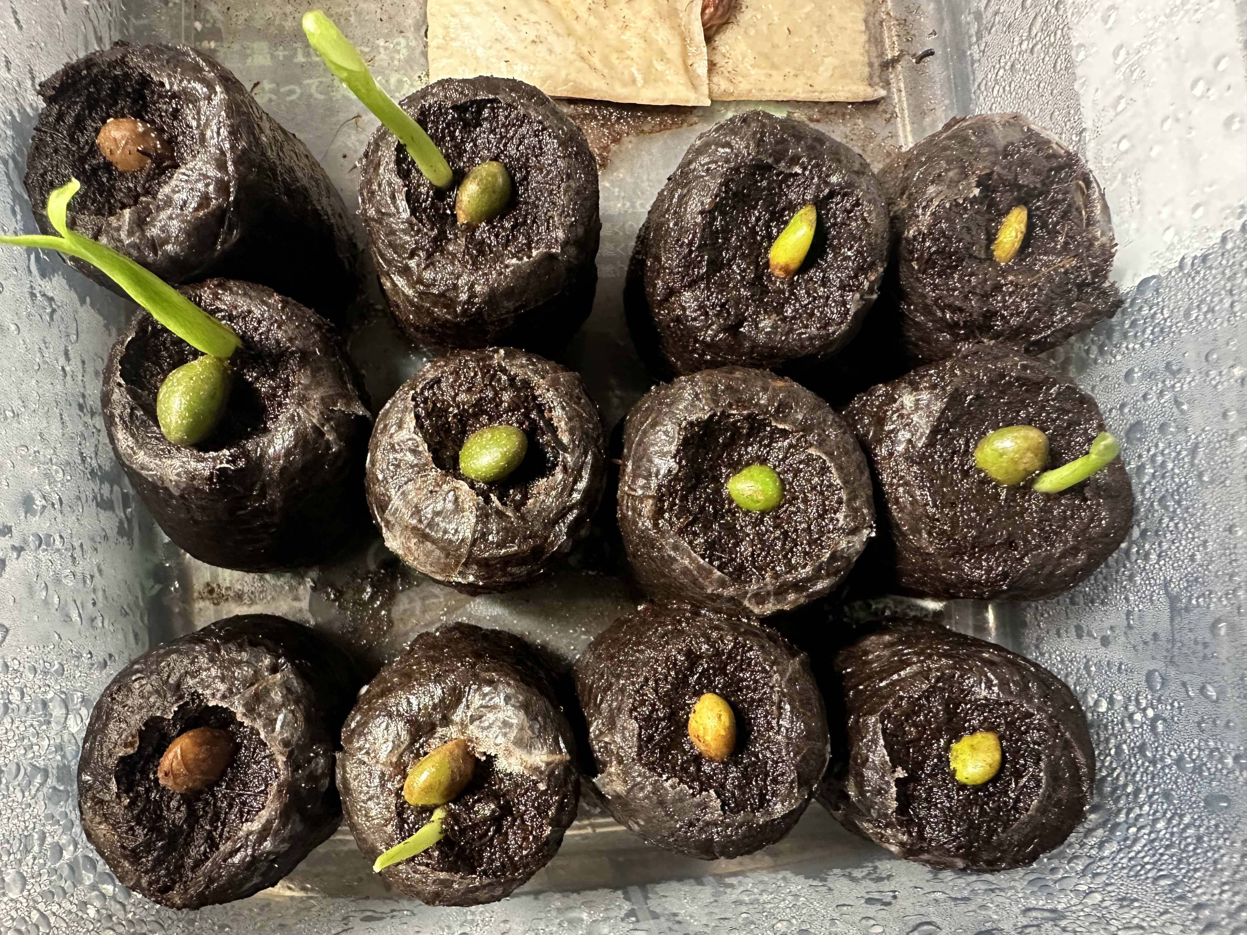 播種前にベンレート水溶液に半日ほど浸漬 ジフィーセブンに埋め込み、覆土なし、ラップをふんわり、ベンレート水溶液で腰水 1日2回ベンレート水溶液を噴霧 20℃〜25℃でLED12時間照射。