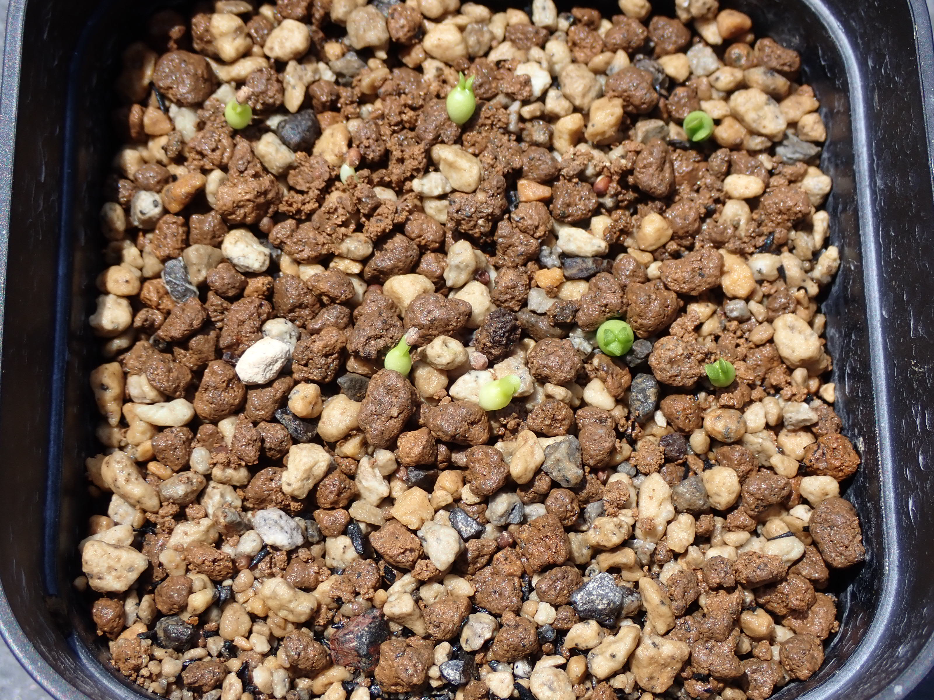 何度かユーフォルビアを実生していると、種を湿らせた時に、ぬめりがでて発芽がおそいと、その部分がカビやすくなる気がしていたので、ダコニール水溶液につける前に少し水に浸してみると表面にゼリー状の膜が出たのでキッチンペーパーとピンセットを使って除去しました(水に浸す時間が長いと種がやわらかくなって、つぶれやすくなるので注意)