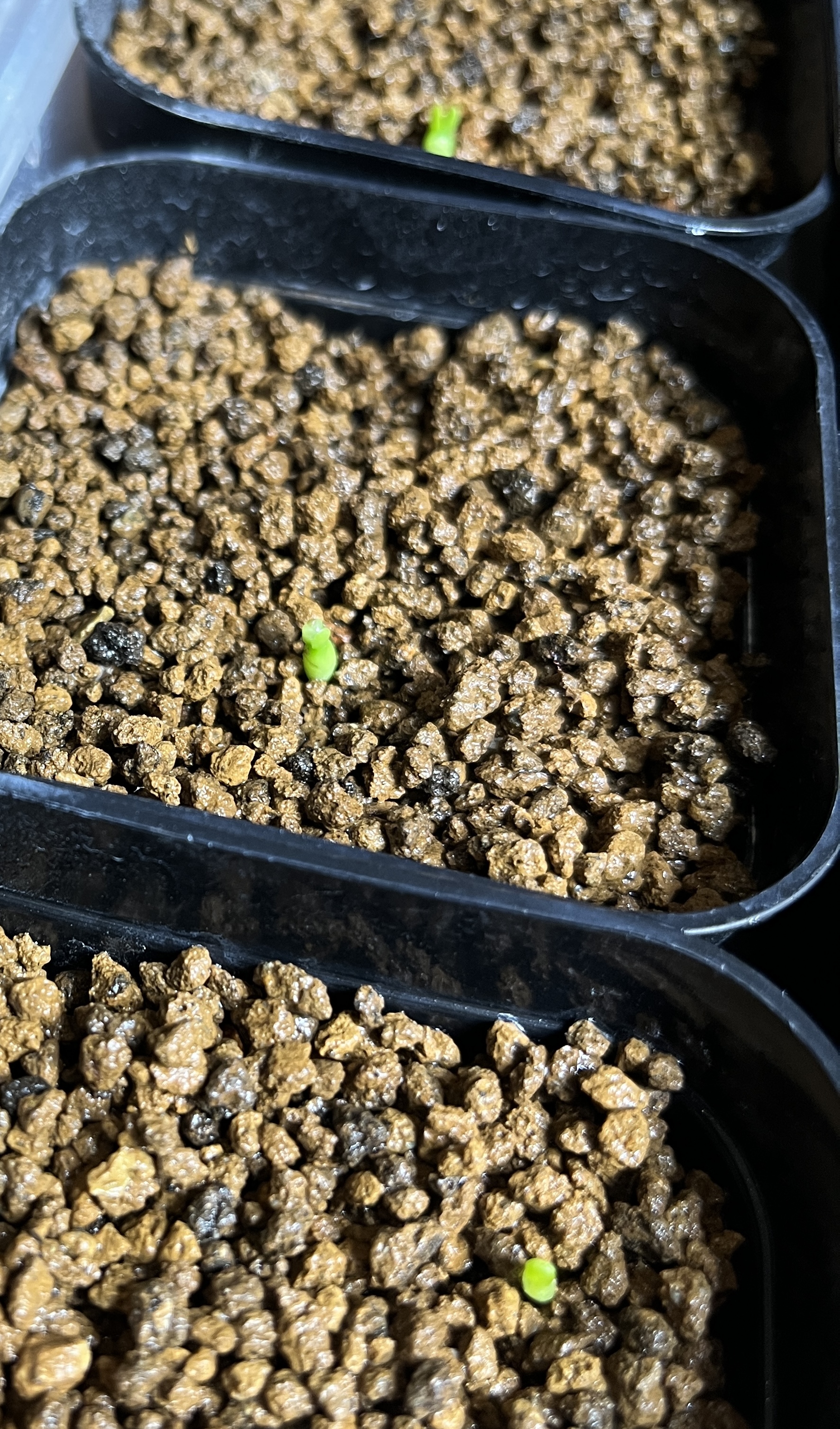 播種日 / 撮影日 ]例: 2024/4/8播種 2024/4/20撮影[ 播種数 / 発芽数 ]例: 11粒/ 3粒[ その他(用土や管理方法など)]例: 播種前にベンレート+メネデール溶液に12時間程度浸漬赤玉土・鹿沼土メインの培養土の表面に、赤玉細粒を厚めに敷いて少し土が覆い被さる様に播種
