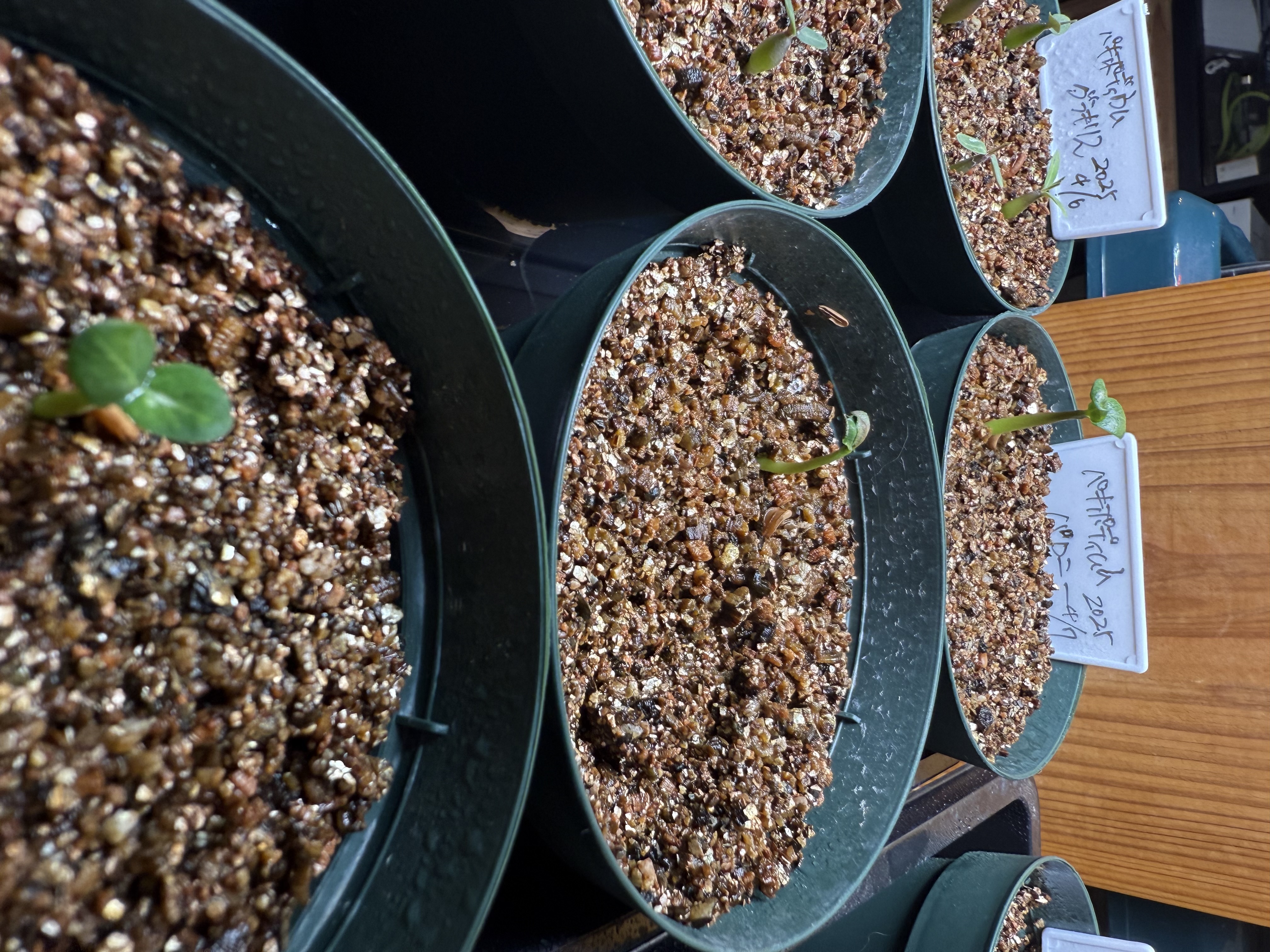 [ 播種日 / 撮影日 ] 2025/4/7播種 2025/4/23撮影[ 播種数 / 発芽数 ] 6粒/ 3粒[ その他(用土や管理方法など)]播種前にベンレート+メネデール溶液に半日程度浸漬。赤玉鹿沼軽石ゼオライトの用土の上に細目のバーミキュライトを表土にしました。25℃前後湿度75%(沖縄)播種から4〜8日目で計3粒発芽。大事に育てていきたいと思います。