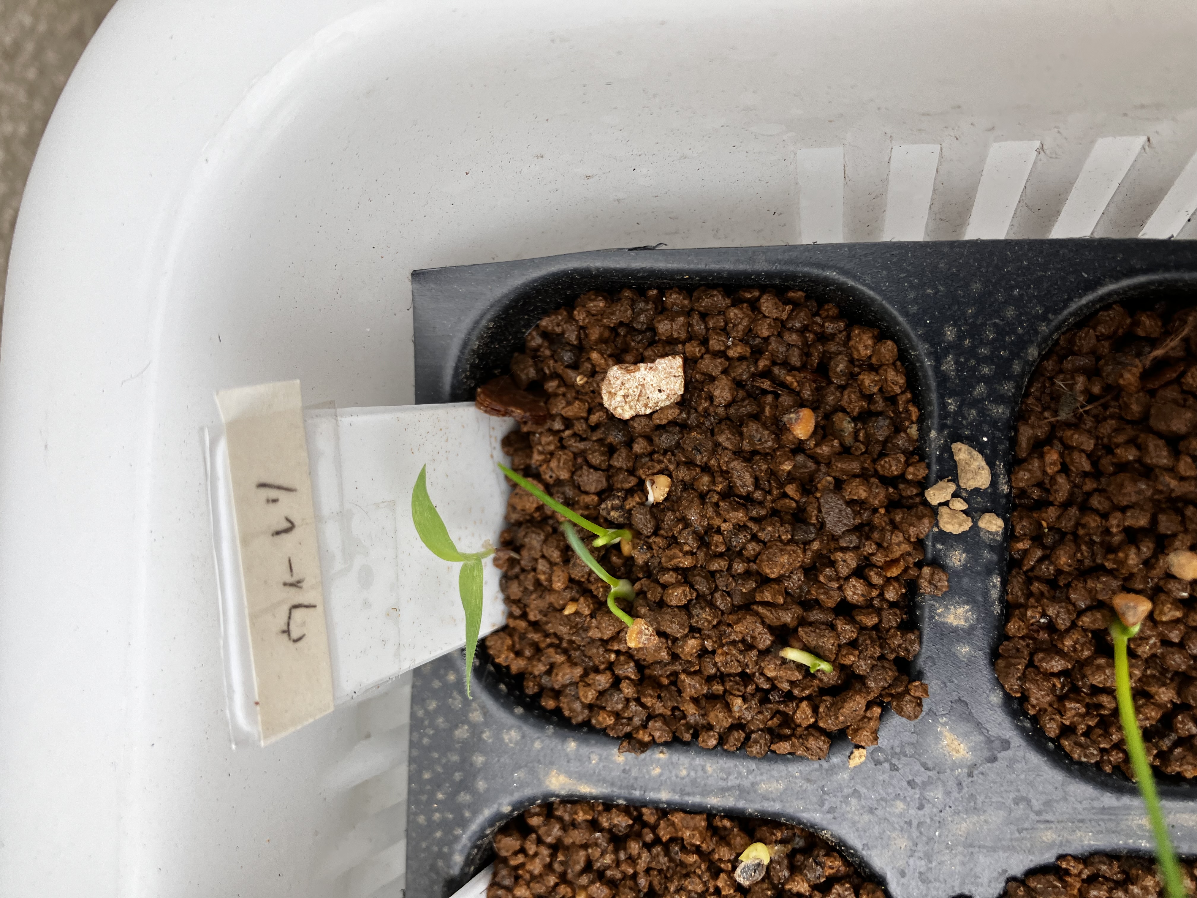 [ 播種日 / 撮影日 ]例: 2025/3/31播種 2025/4/25撮影[ 播種数 / 発芽数 ]例: 21粒/ 12粒[ その他(用土や管理方法など)]例: 播種前にメネデール溶液に1日程度浸漬赤玉メインの用土に細目のバーミキュライトを敷き播種