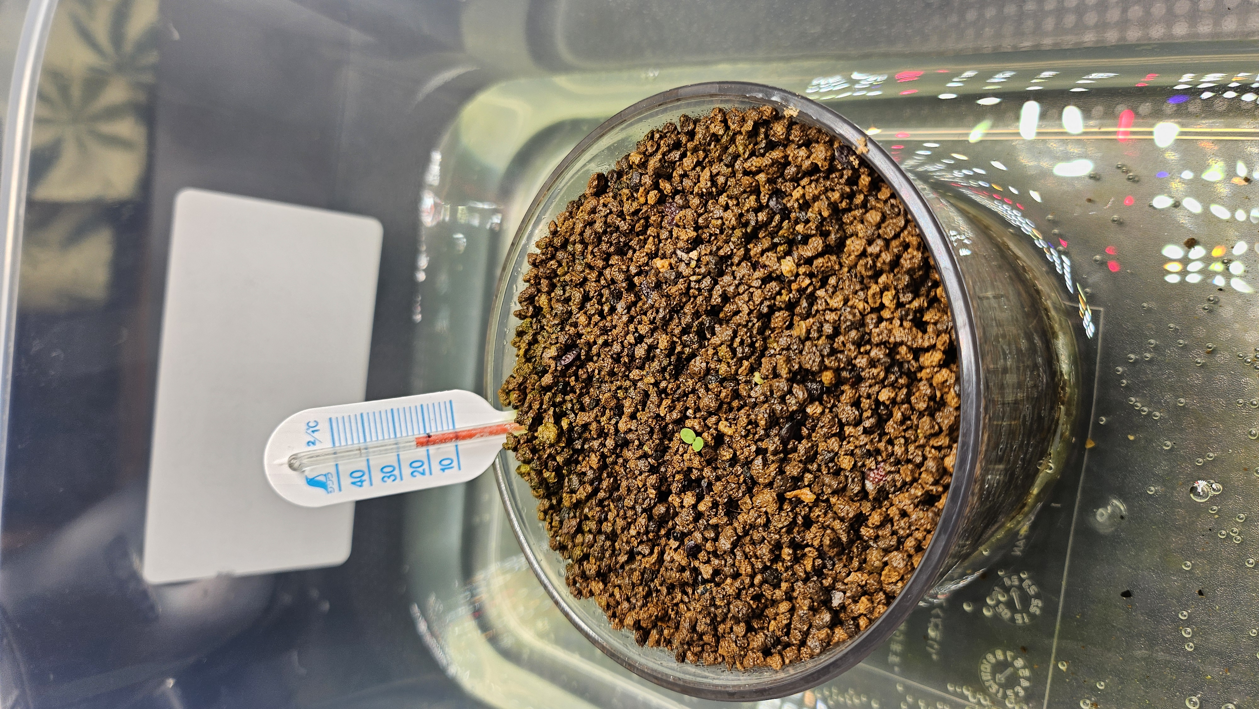多めに軽石を入れ、多肉植物用培養土の上に細目の赤玉土を敷き播種し軽く覆土、ヒートマット上で鉢温度25度で、蓋の出来る容器に入れ腰水管理