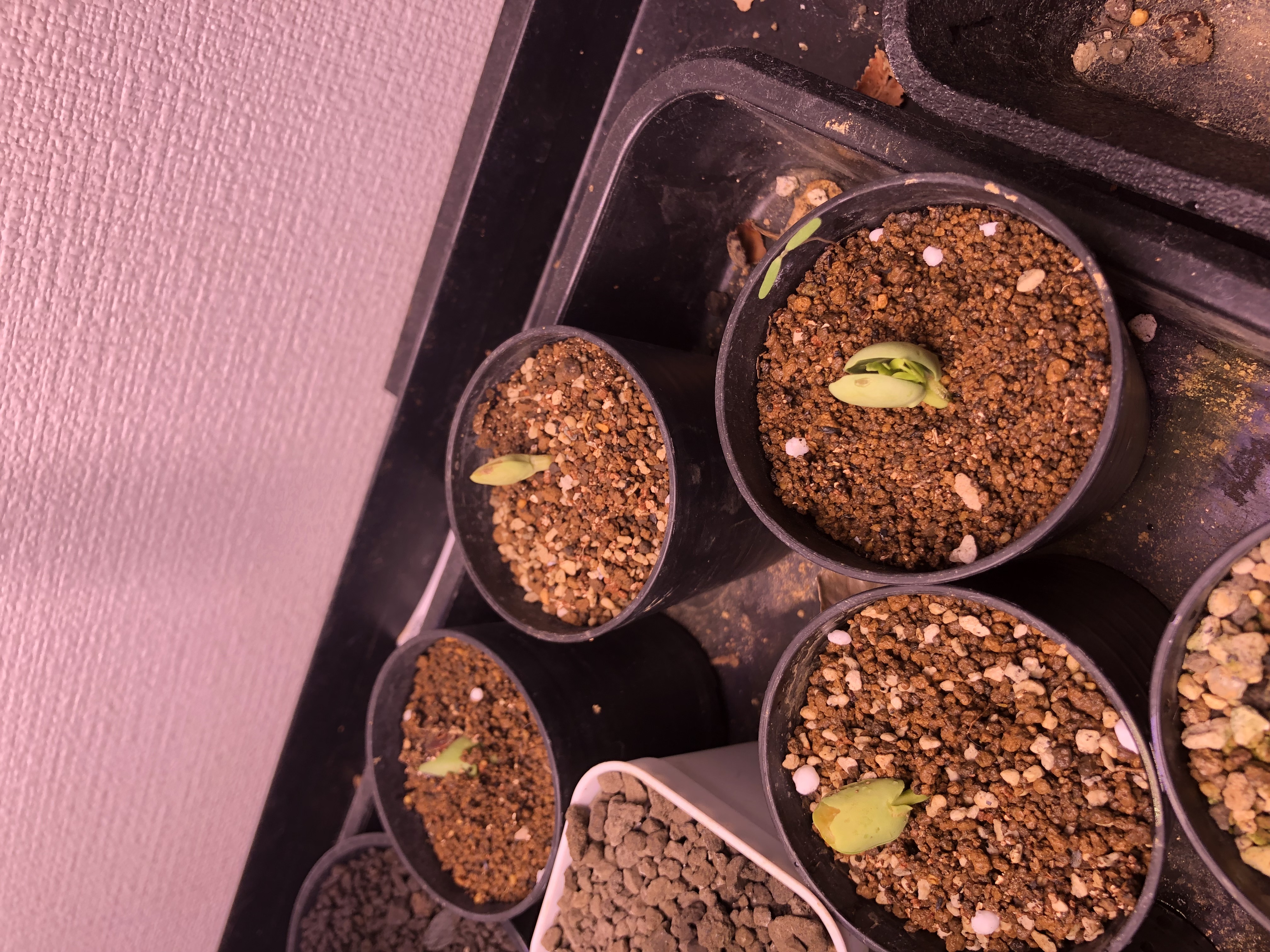 胚を傷つけつけないように殻の反対側を傷つけて中身を露出させ、ベンレートとメネデールを入れた水に24時間浸水。赤玉細粒を入れた鉢(腰水)に種を置いてラップで保湿し室内保管。