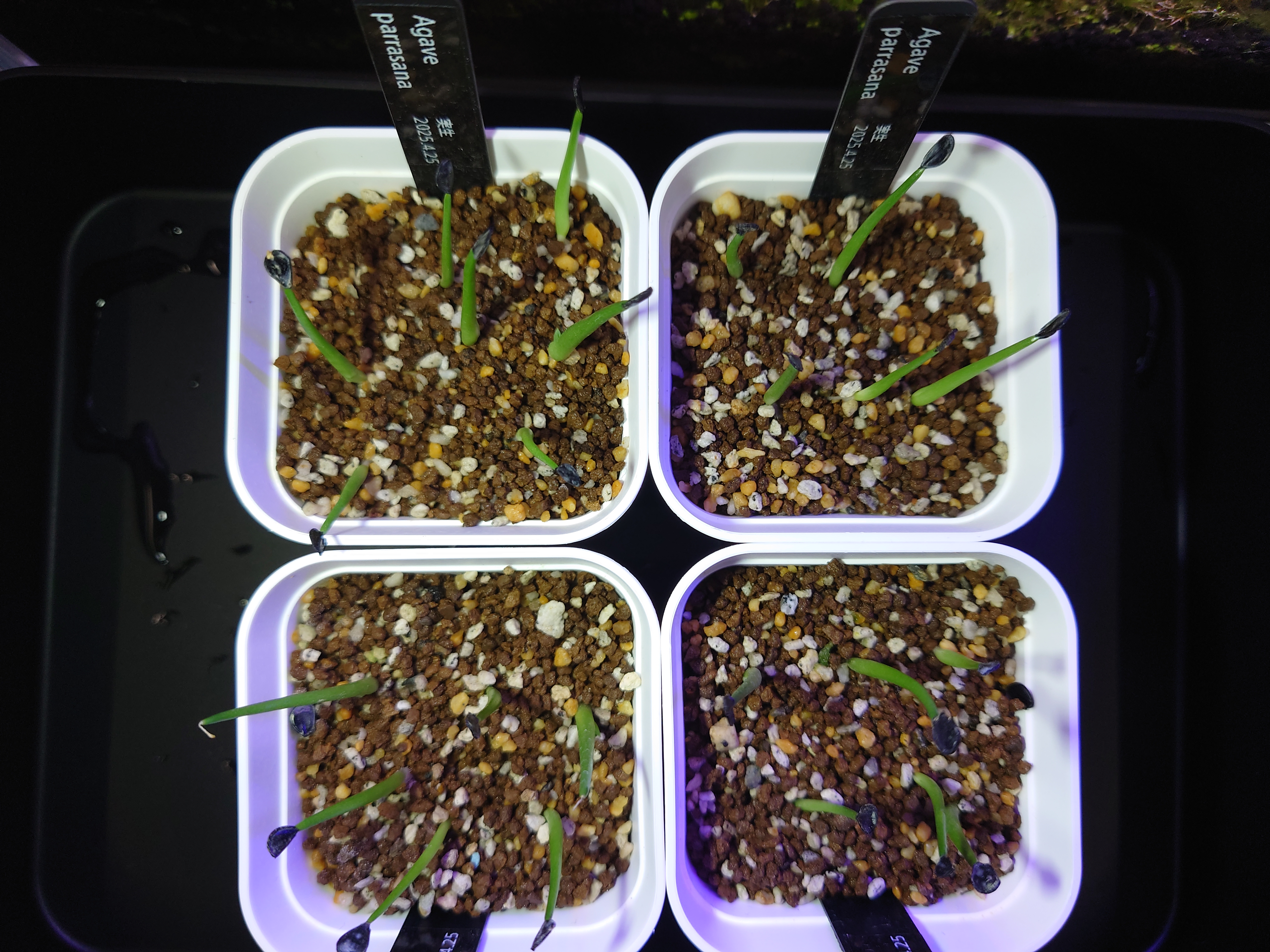 赤玉メインの用土に細目の赤玉土、鹿沼土、軽石を敷き播種、室内、LED、加温有り、ラップで密閉、20度〜25度で管理、1週間しても発根しなかったので、プラコップに水を含ませたキッチンペーパーを敷いて播種、発根した種から土に戻した。