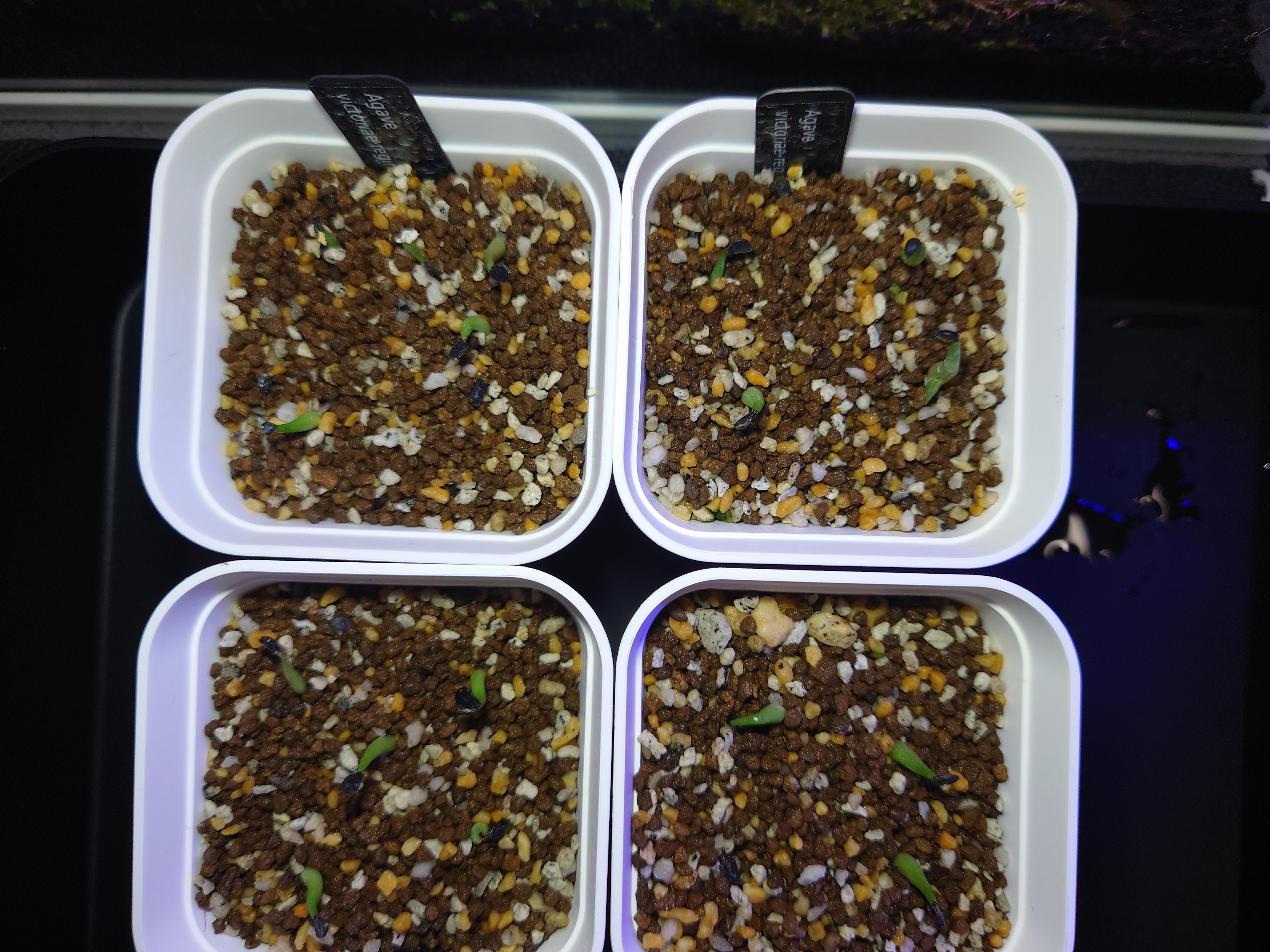 赤玉メインの用土に細目の赤玉土、鹿沼土、軽石を敷き播種、室内、LED、加温有り、ラップで密閉、20度〜25度で管理、1週間しても発根しなかったので、プラコップに水を含ませたキッチンペーパーを敷いて播種、発根した種から土に戻した。