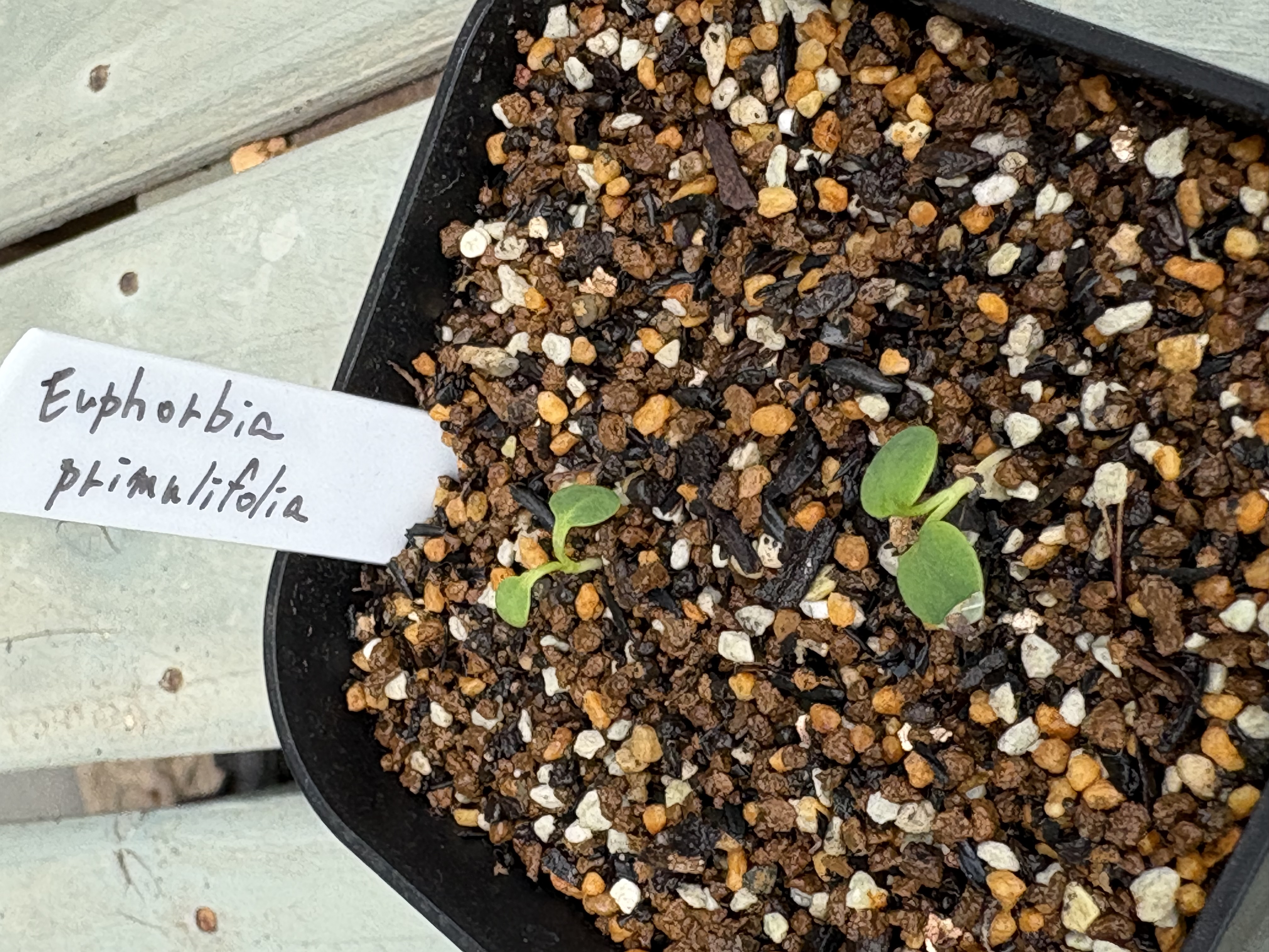 2025/5/9播種 2025/5/23撮影[ 播種数 / 発芽数 ] 12粒/ 2粒[ その他(用土や管理方法など)]播種前にベンレート+メネデール溶液に1日程度浸漬半分は湿らせたキッチンペーパーに播種しラップで密閉