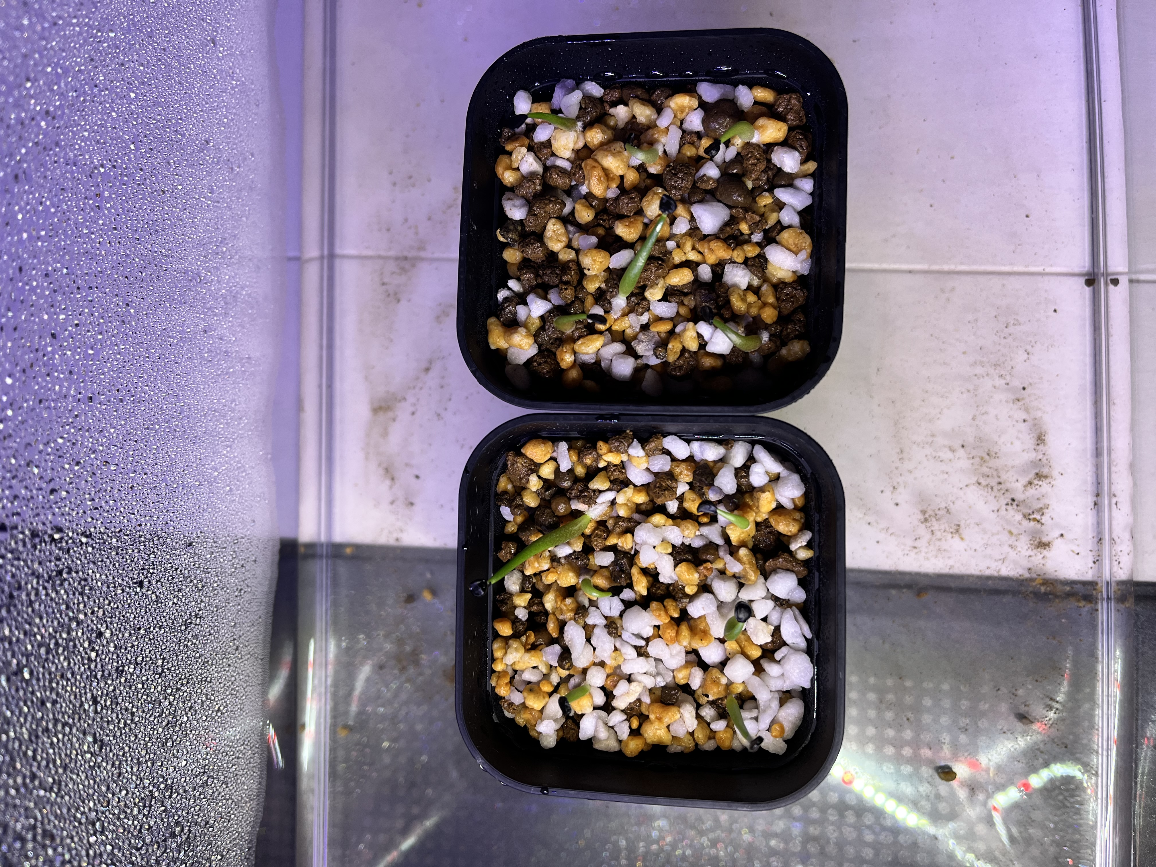 [ 播種日 / 撮影日 ]2025/5/18播種 2025/5/27撮影[ 播種数 / 発芽数 ]12粒/ 12粒[ その他(用土や管理方法など)]播種前にダコニール+メネデール溶液に12時間程度浸漬多肉植物の用土を熱湯で殺菌の後、播種、20度〜25度で管理