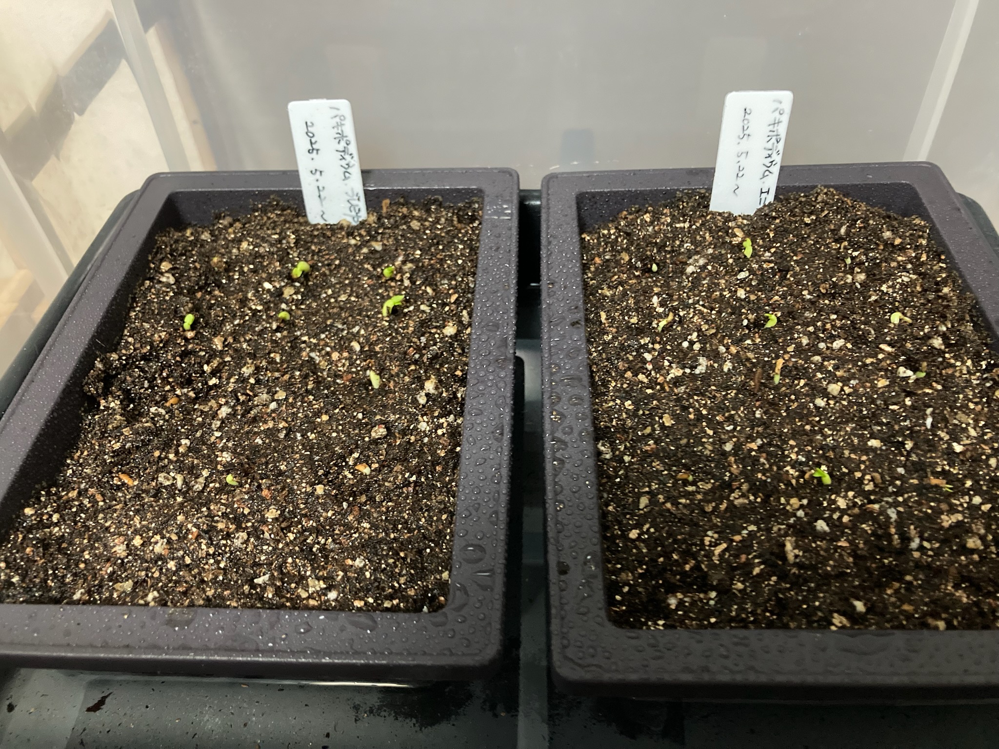 覆土をしてしまった事と播種後に気温が15℃を下回る日が2日ほどありましたが、その後は20~25℃をキープでき、それぞれ3日目くらいから発芽し始め、