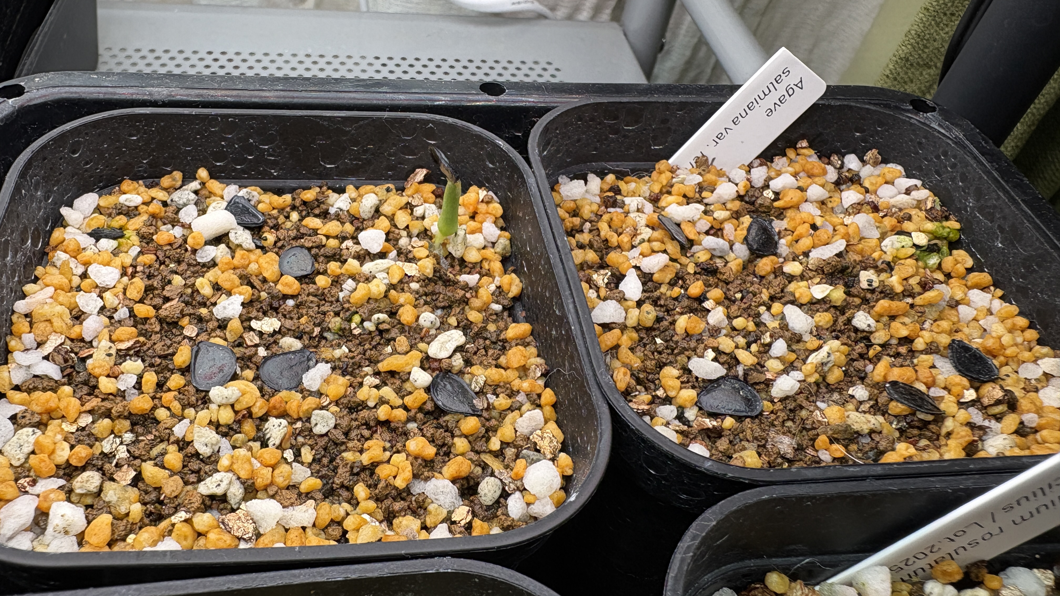 鉢底に日向土、メインに多肉植物用の播種用土を使用し播種、腰水管理で軽くラップをかけ毎朝晩霧吹きをし、約23度管理