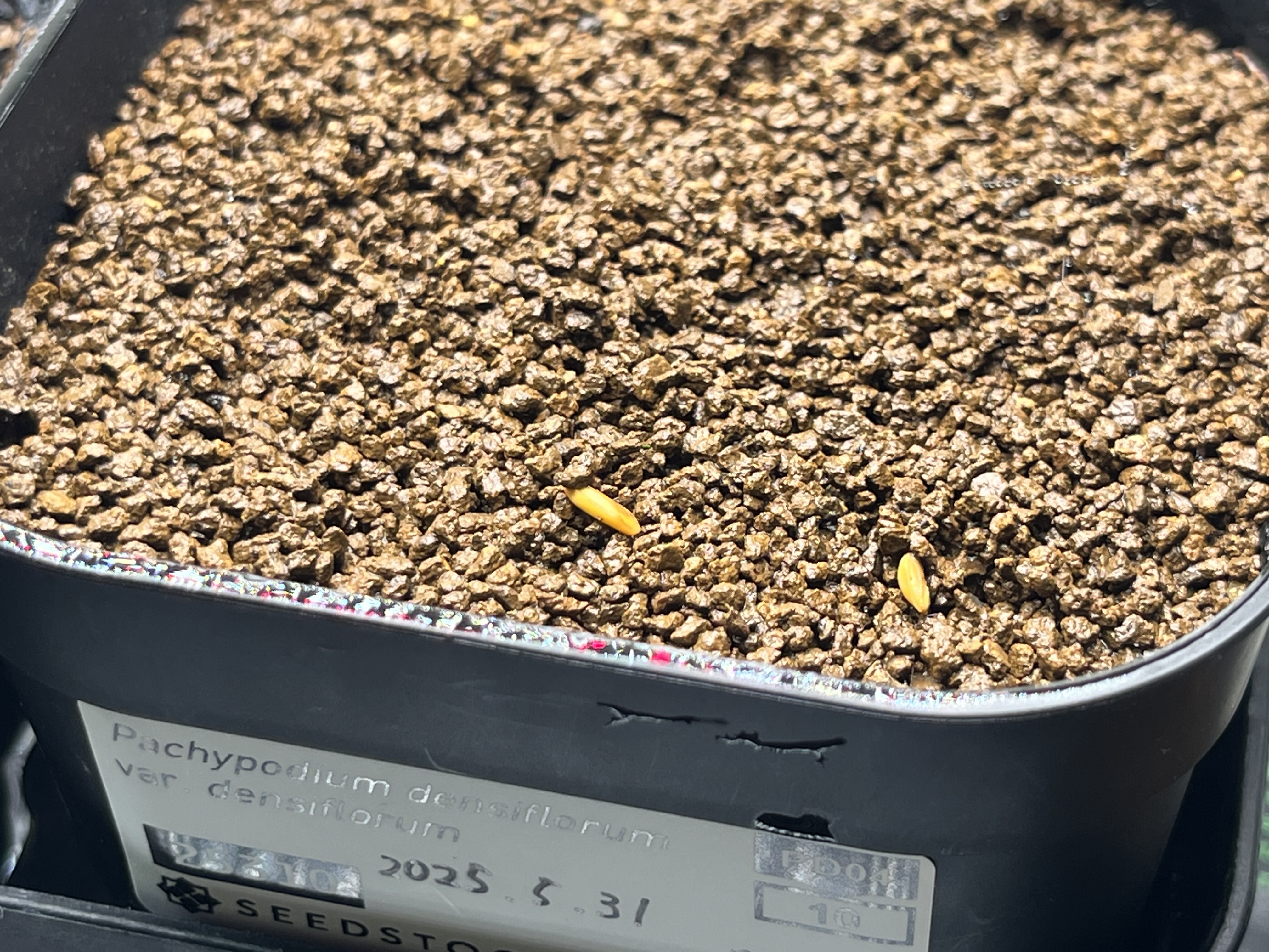 2025/5/31播種 2025/6/4撮影12粒/ 0粒播種前にベンレート+メネデール溶液に半日程度浸漬した後、多肉用土に赤玉細粒敷いて播種しました。