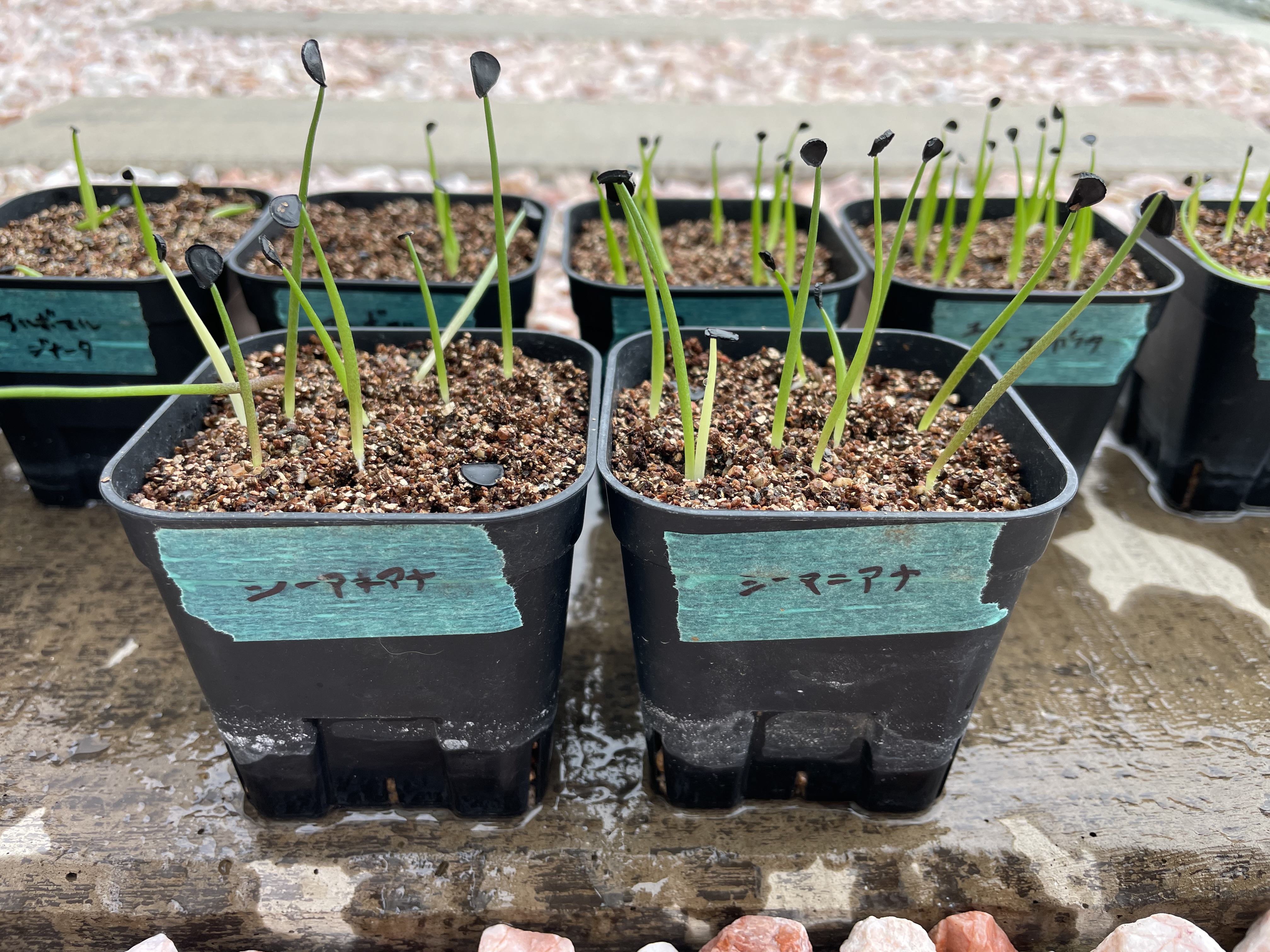 [ 播種日 / 撮影日 ]2025/5/15播種 2025/6/1撮影[ 播種数 / 発芽数 ]25粒/ 19粒[ その他(用土や管理方法など)]播種前にダコニール+メネデール溶液に1日程度浸漬赤玉メインの用土に細目のバーミキュライトを敷き播種、20度〜25度で管理