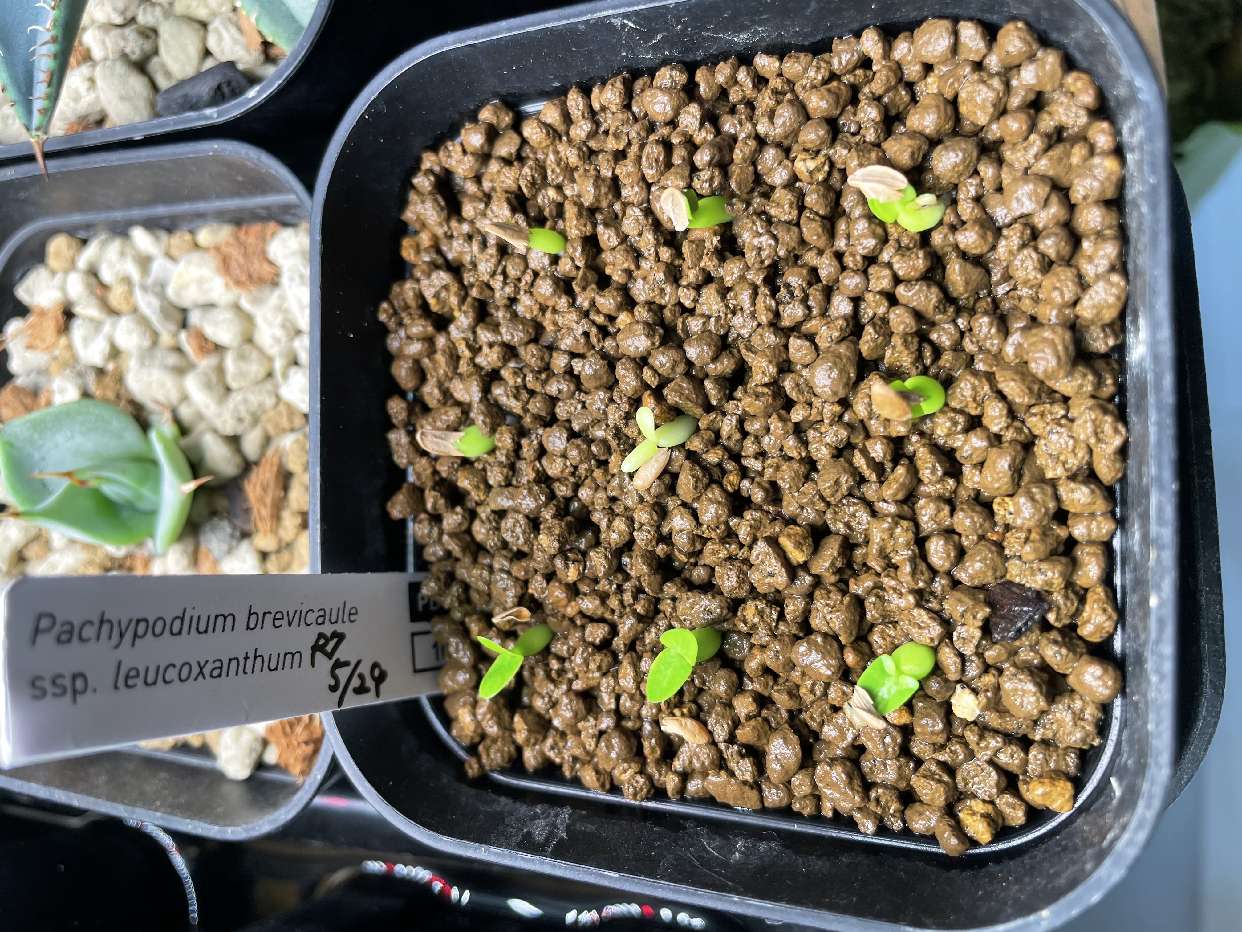 上記液を染み込ませたキッチンペーパー上(タッパー内で加湿)で22〜25度で管理発芽後、赤玉(細粒)メインの用土に植え替え
