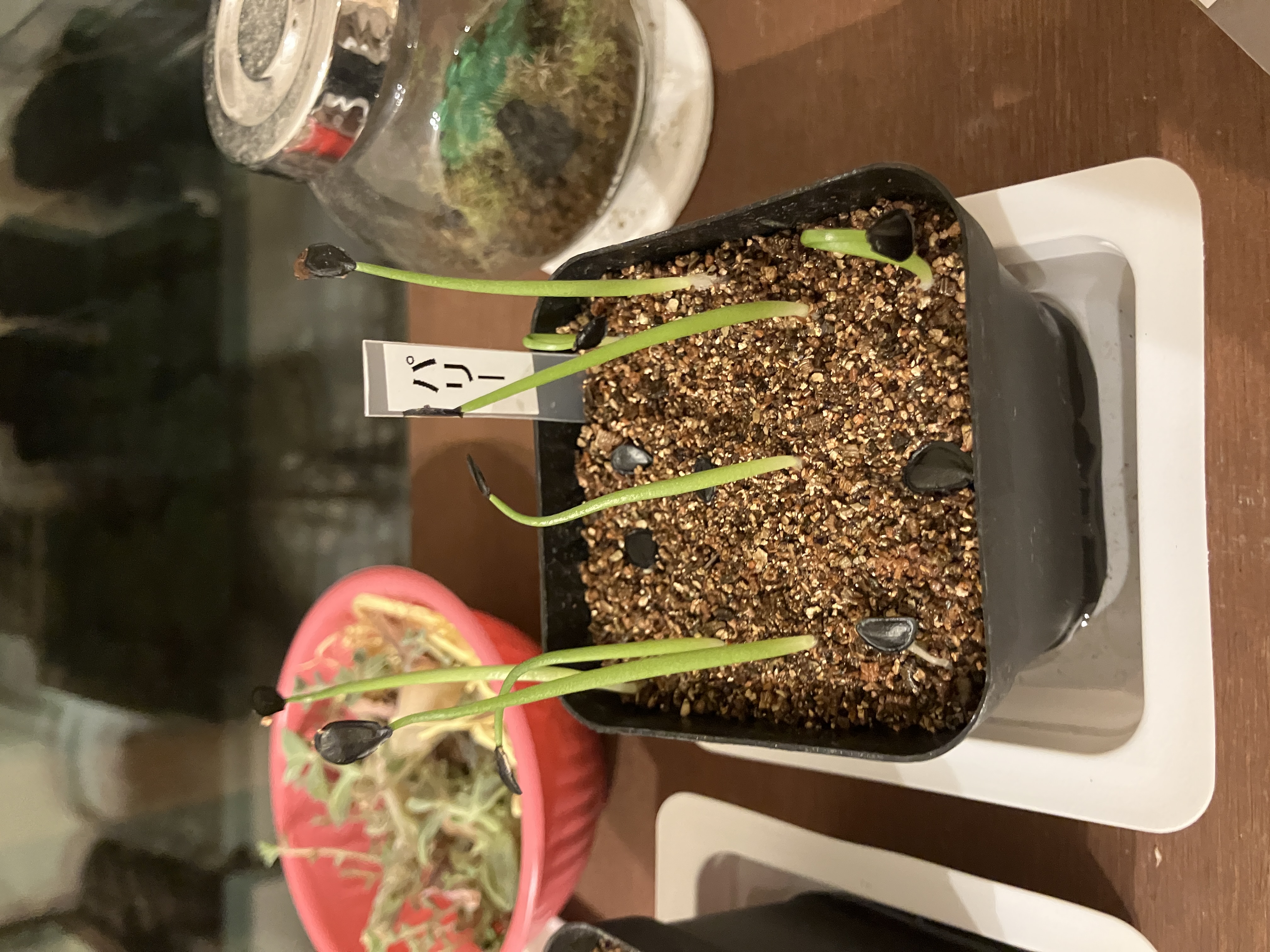 種子が届いた翌日に蒔きました。通常の多肉用の土の表面にバーミキュライトを使用して吸水させました。
