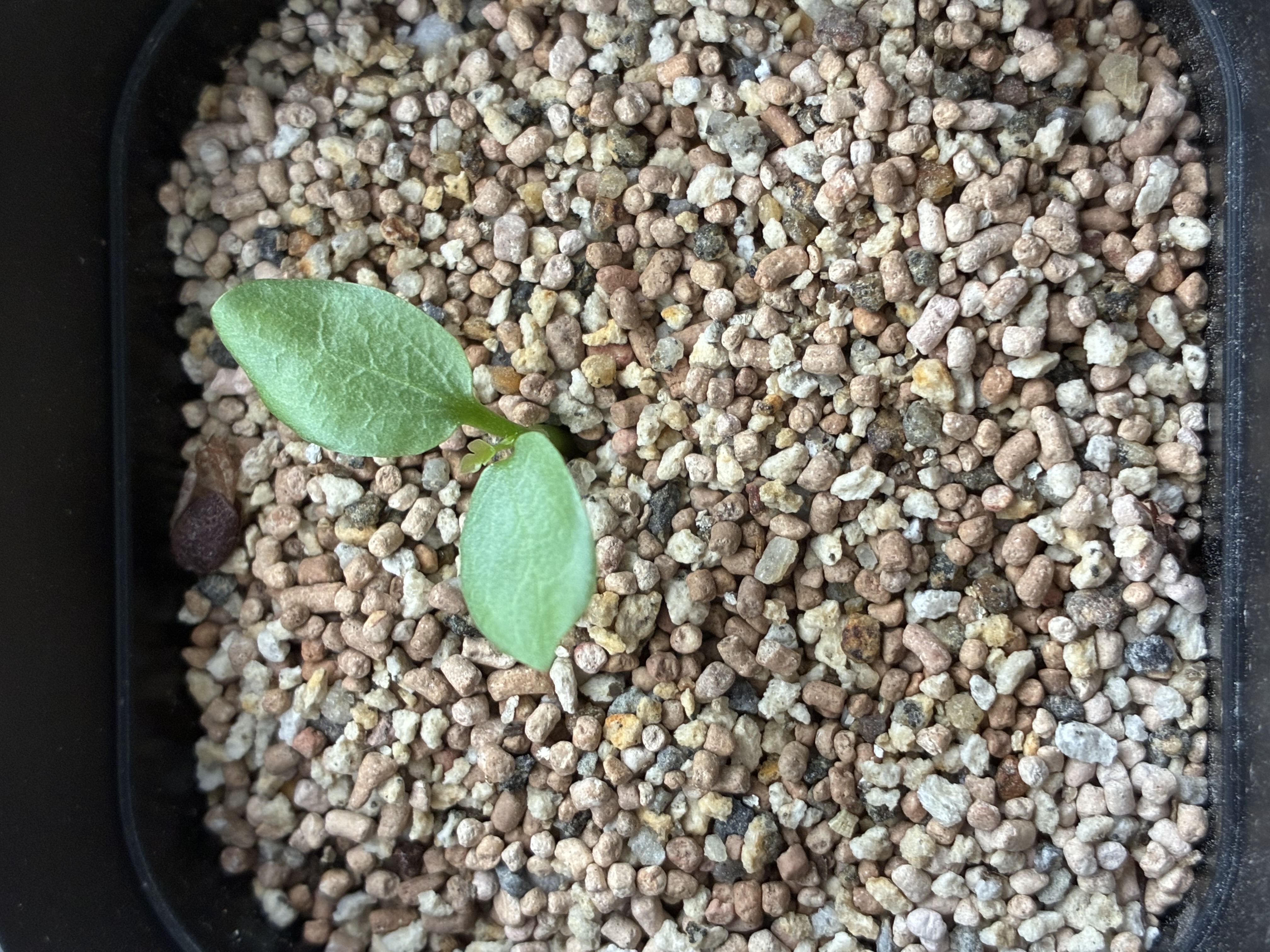 [ 播種日 / 撮影日 ]2025/6/1播種 2025/6/15撮影[ 播種数 / 発芽数 ]6粒/ 1粒[ その他(用土や管理方法など)]播種前に水につけて種の周りの汚れをキレイに落としてから赤玉メインの用土の上に播種、細目の多肉植物用の土を1センチ位被せ、室温20度〜30度で管理